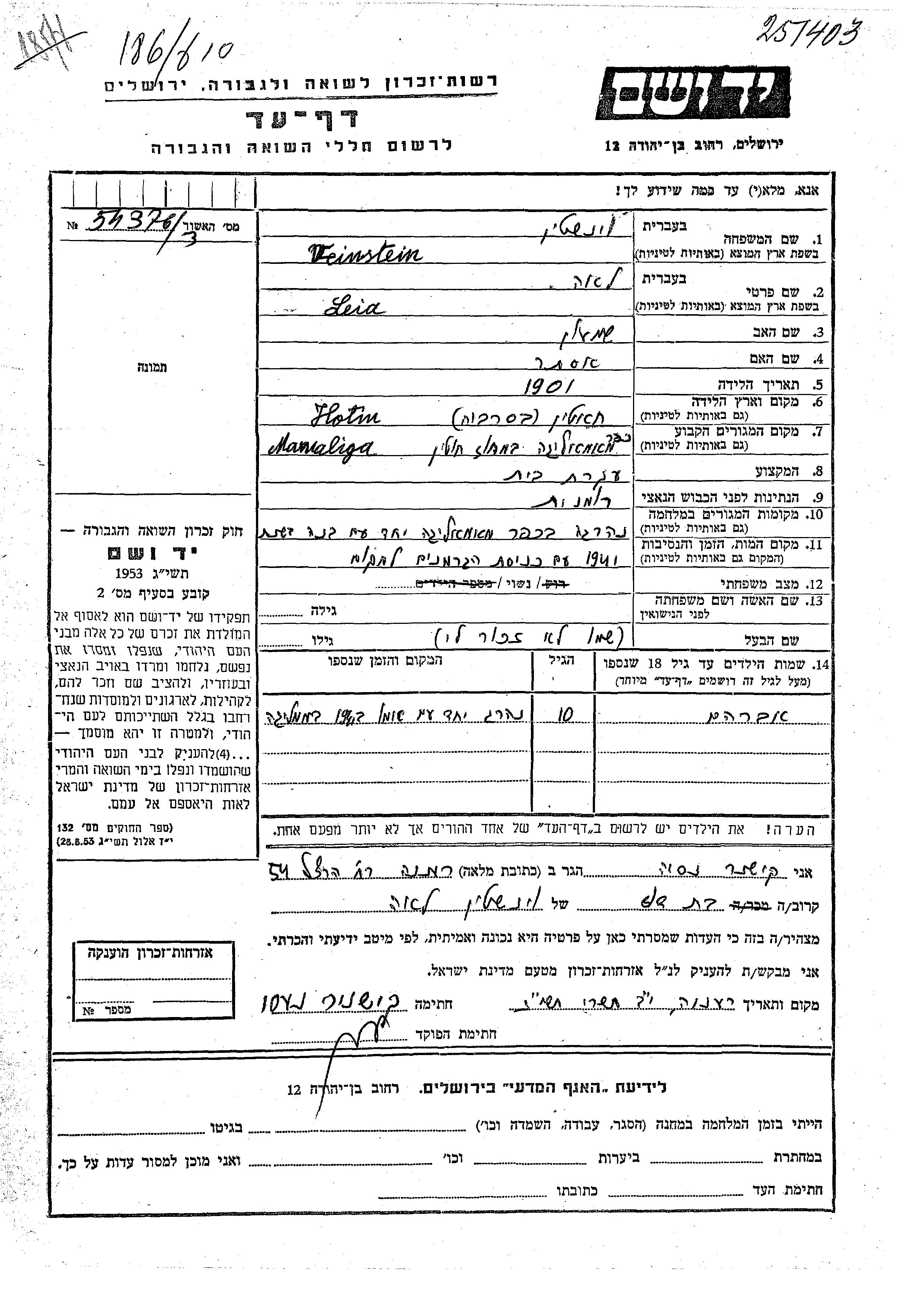 Яд Вашем - Листы свидетельских показаний Мемориального фонда
