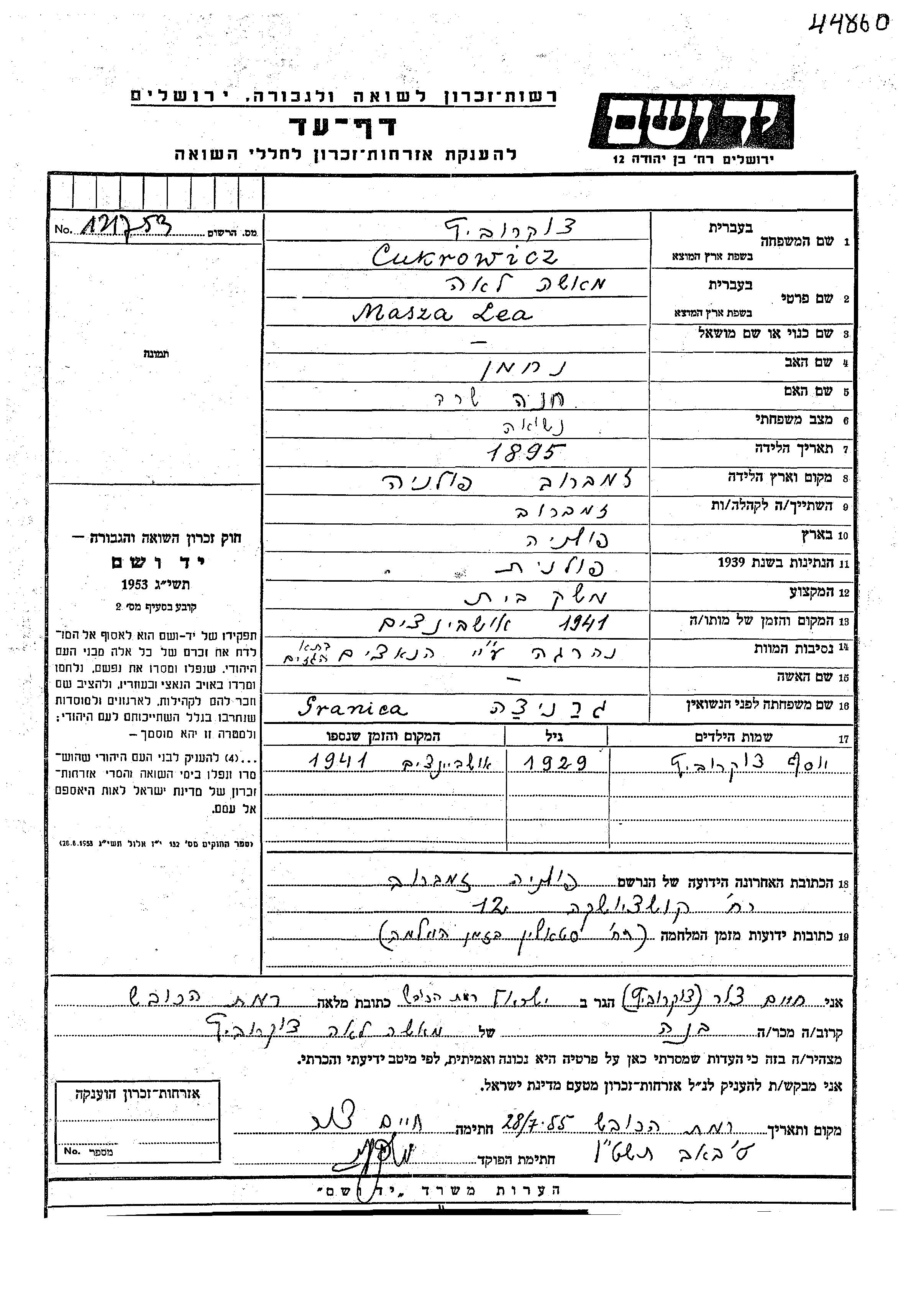 Иосеф Цукрович. Mать:Маша Лея, девичья фамилия Граница. Ребенок. Место жительства до войны: Замбрув, Польша. Место во время войны: Замбрув, Польша.
