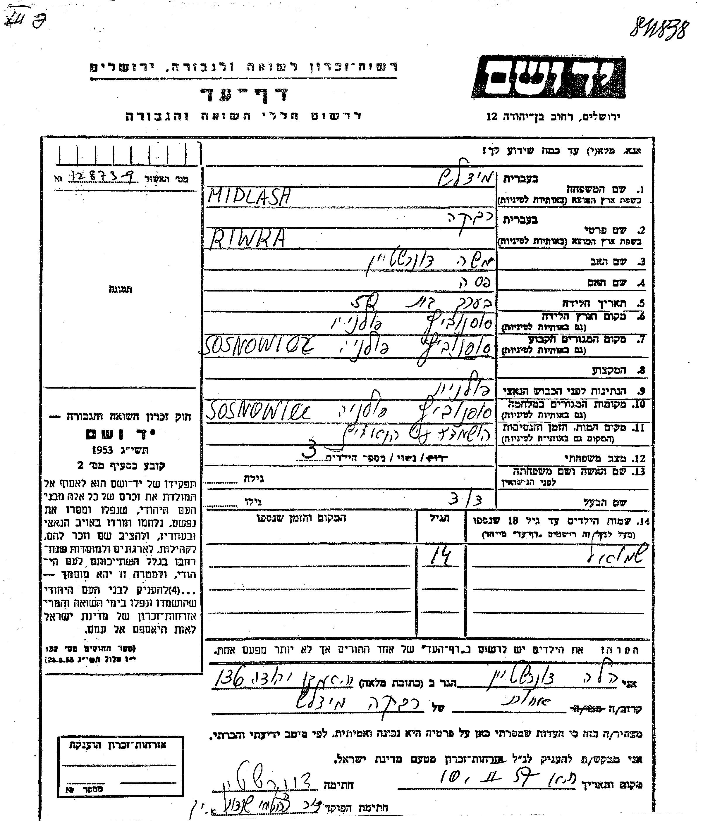 Шмуэль Мидляш Давид Ривка девичья фамилия Донерштейн. Ребенок. Место жительства до войны: Сосновиц, Польша. Место во время войны: Сосновиц, Польша.