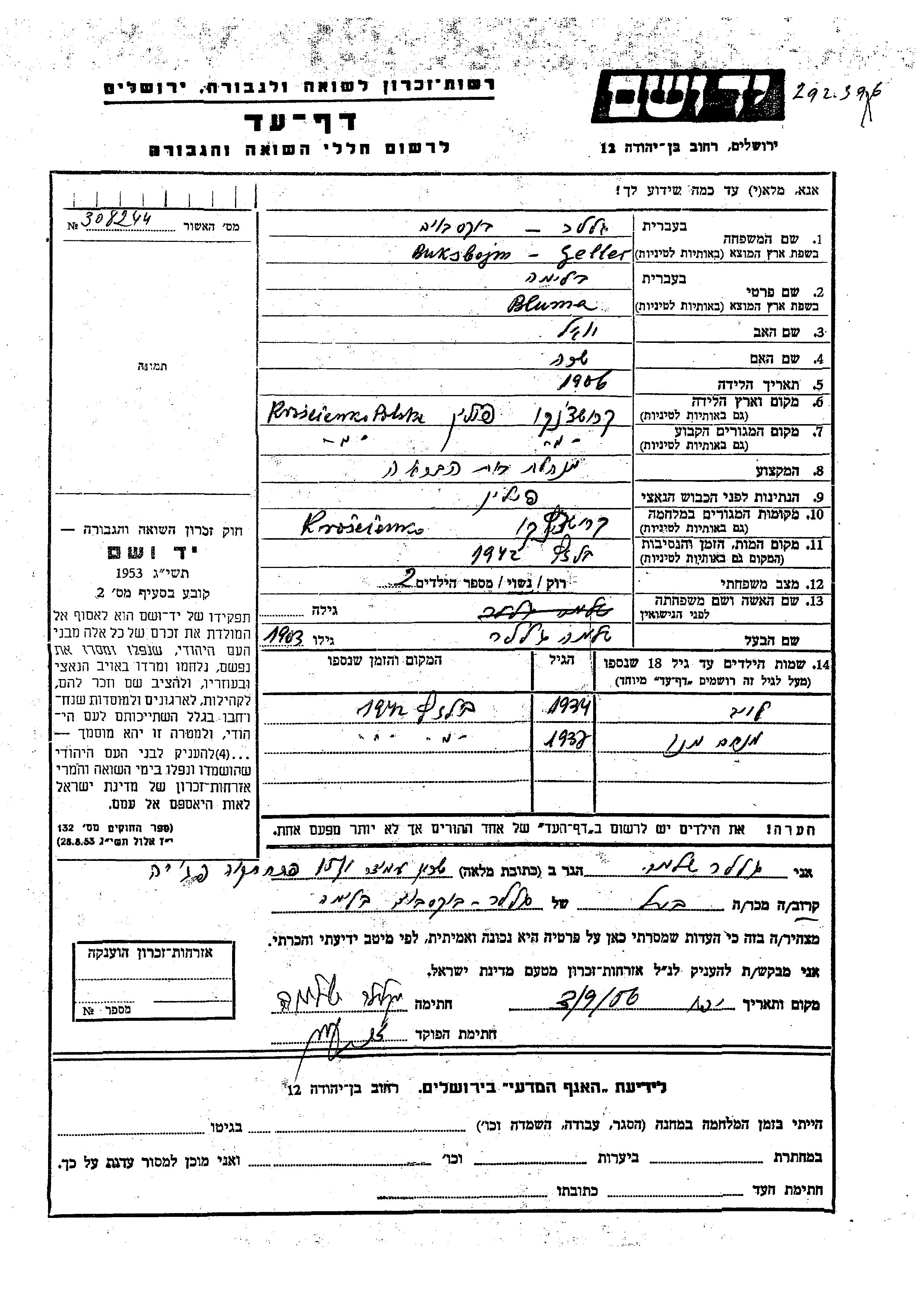 Геллер Боксбойм Менахем Мано 1937 Кросьценко, Польша Лист свидетельских показаний