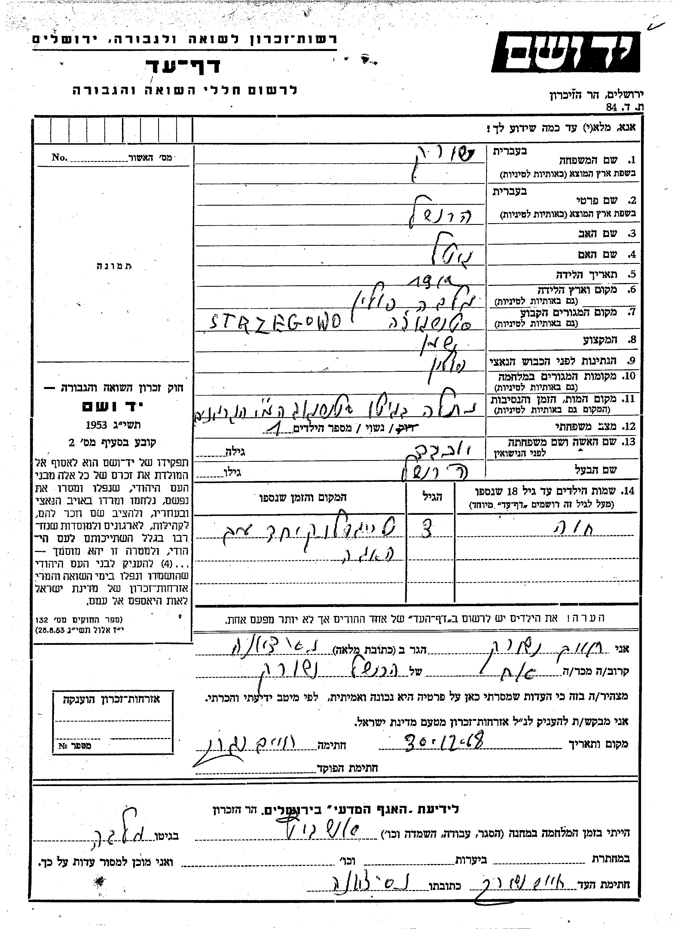 Шурек Хава Стшегово, Польша Лист свидетельских показаний
