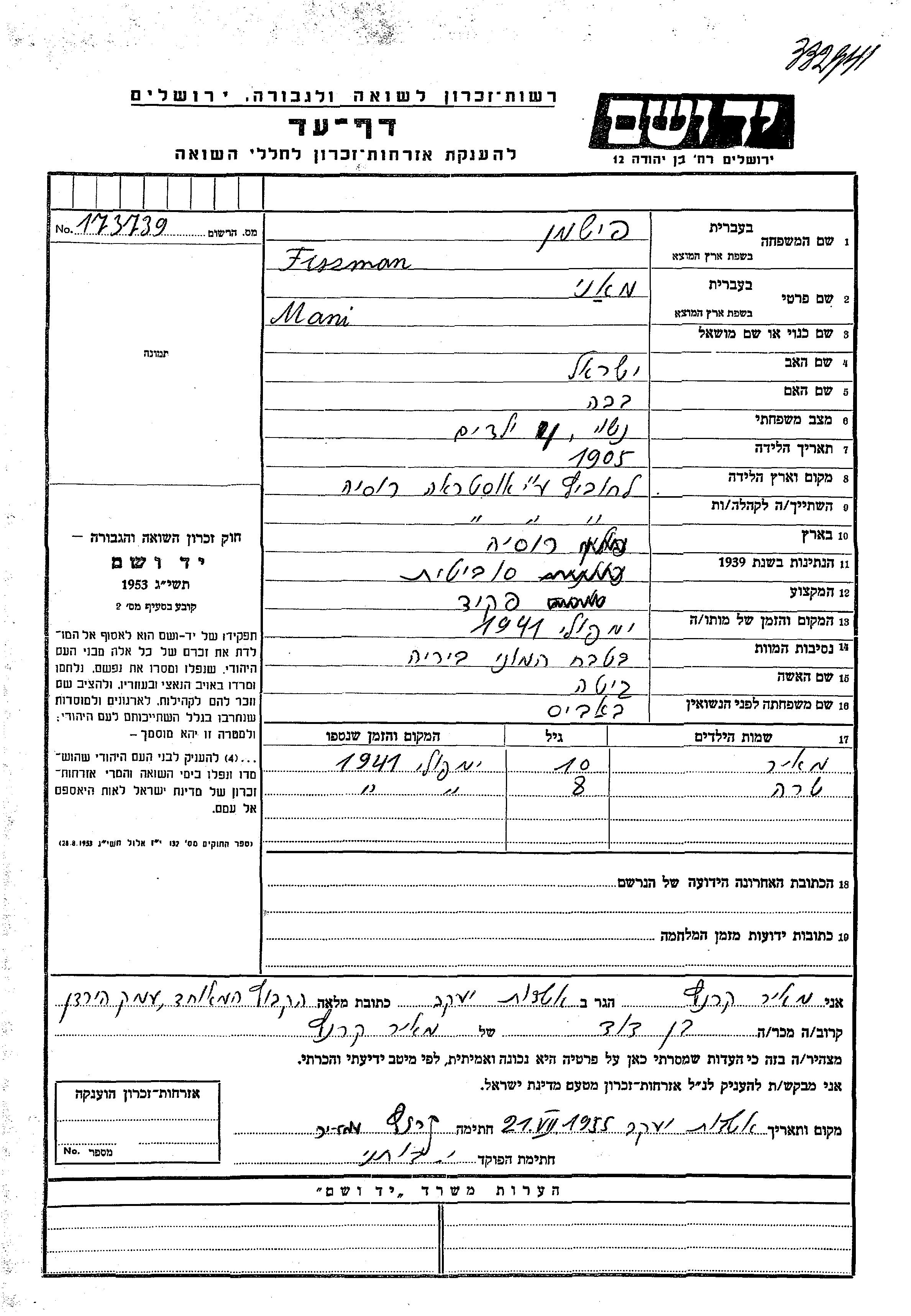 Яд Вашем - Листы свидетельских показаний Мемориального фонда
