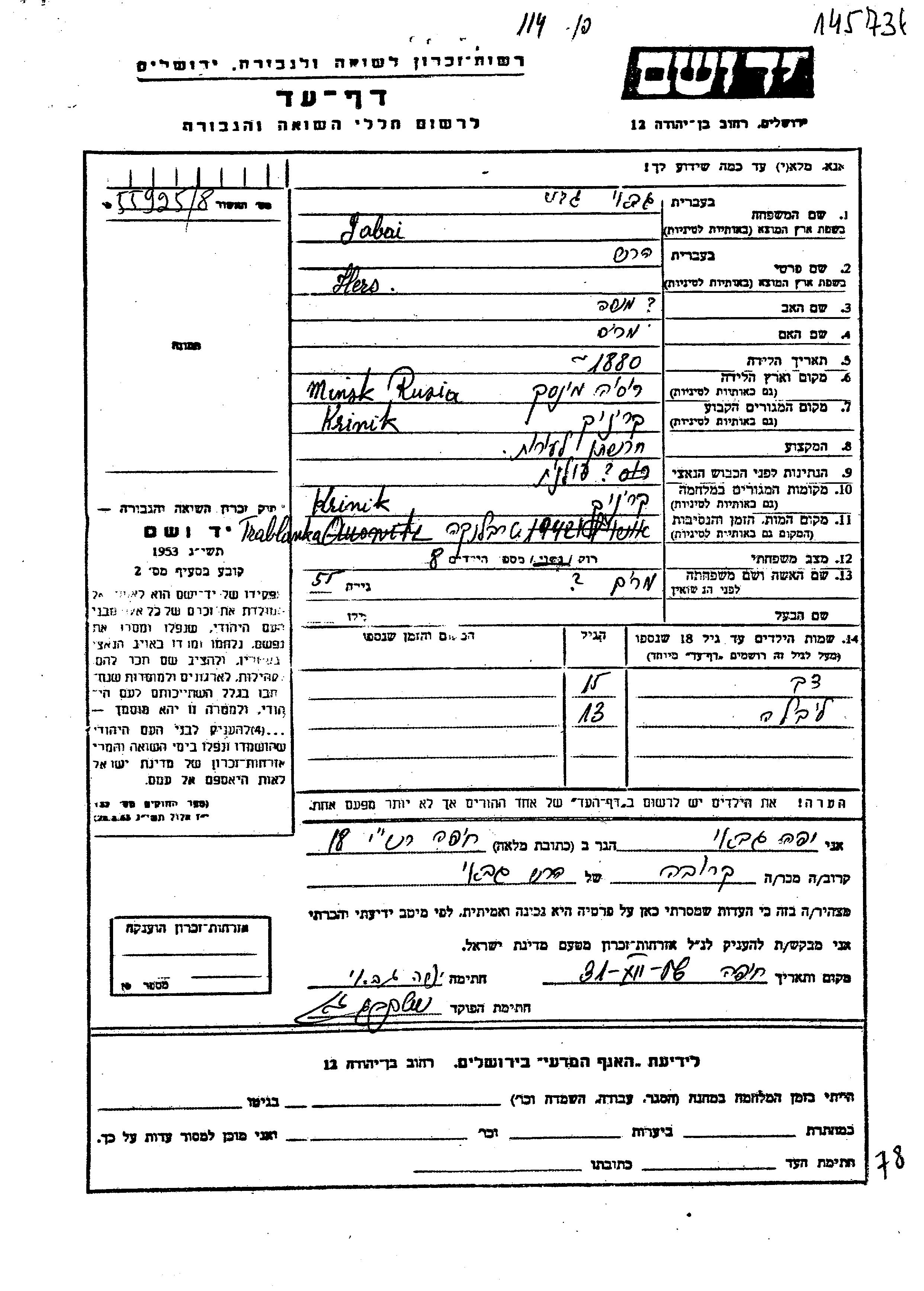 Либа Габай родился/родилась Херш Мирьям. Ребенок. Место жительства до войны: Крынки, Польша. Место во время войны: Крынки, Польша.