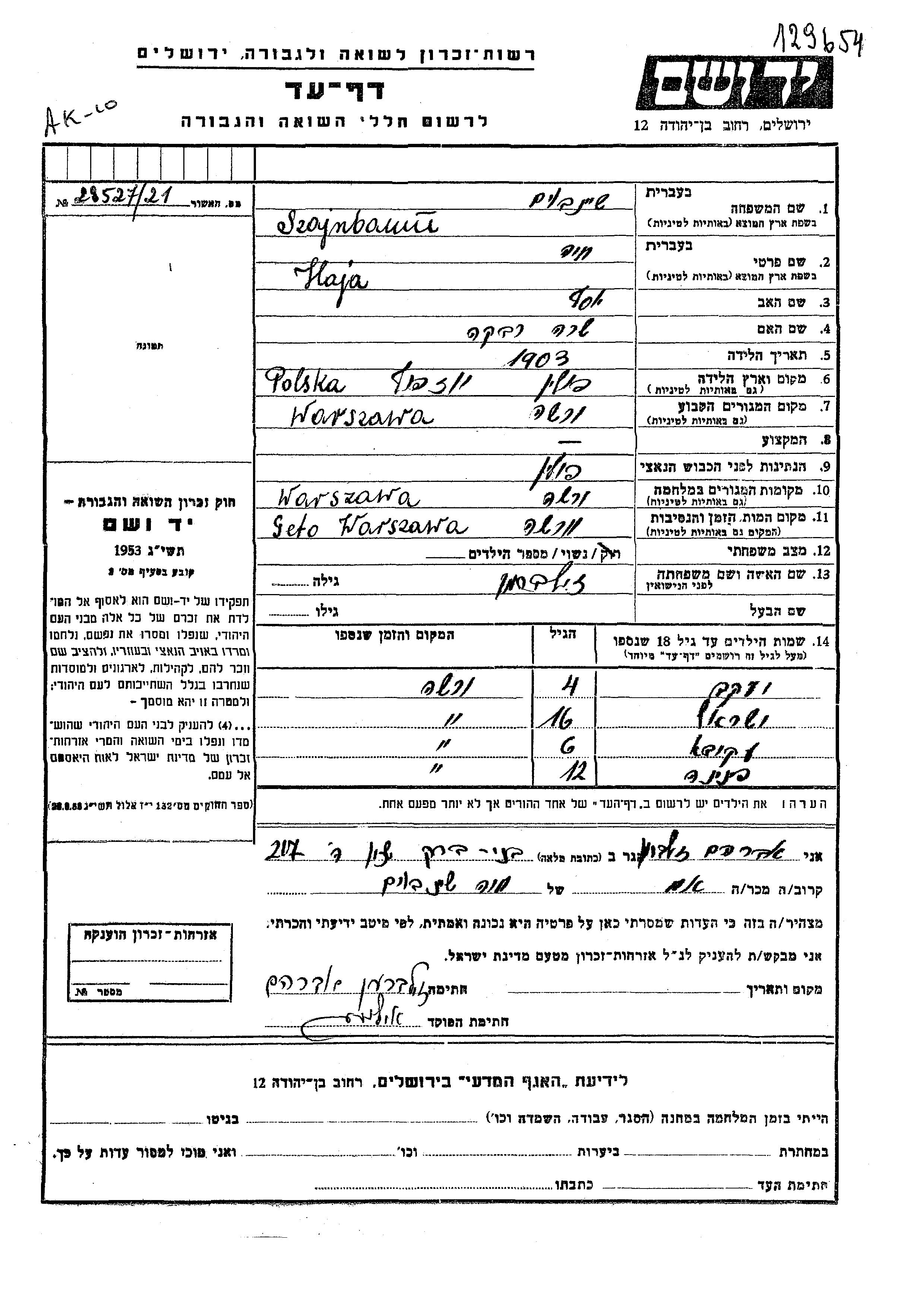 Шайнбаум Исраэль Варшава, Польша Лист свидетельских показаний