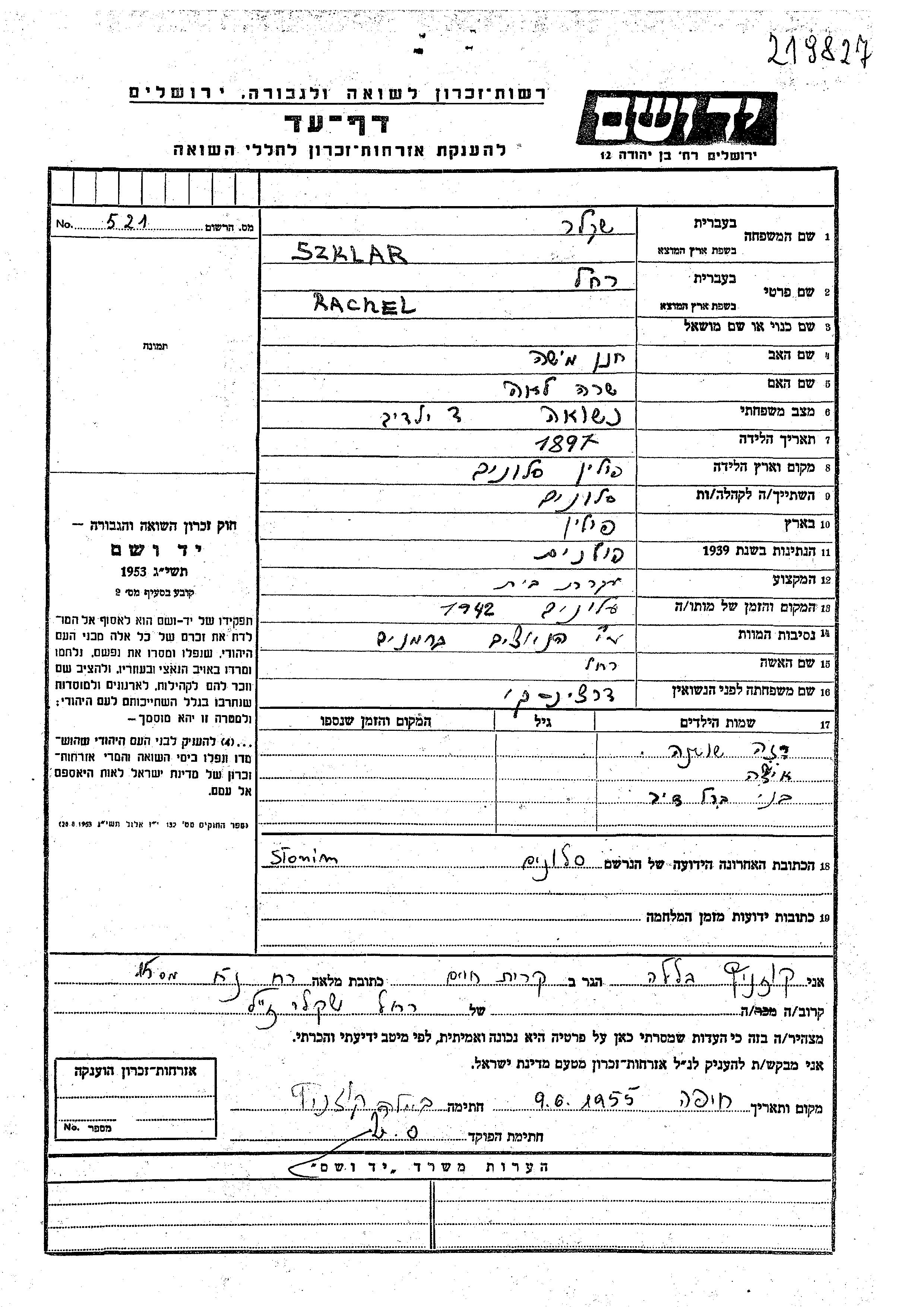 Шкляр Резе Шошана Слоним, Польша Лист свидетельских показаний