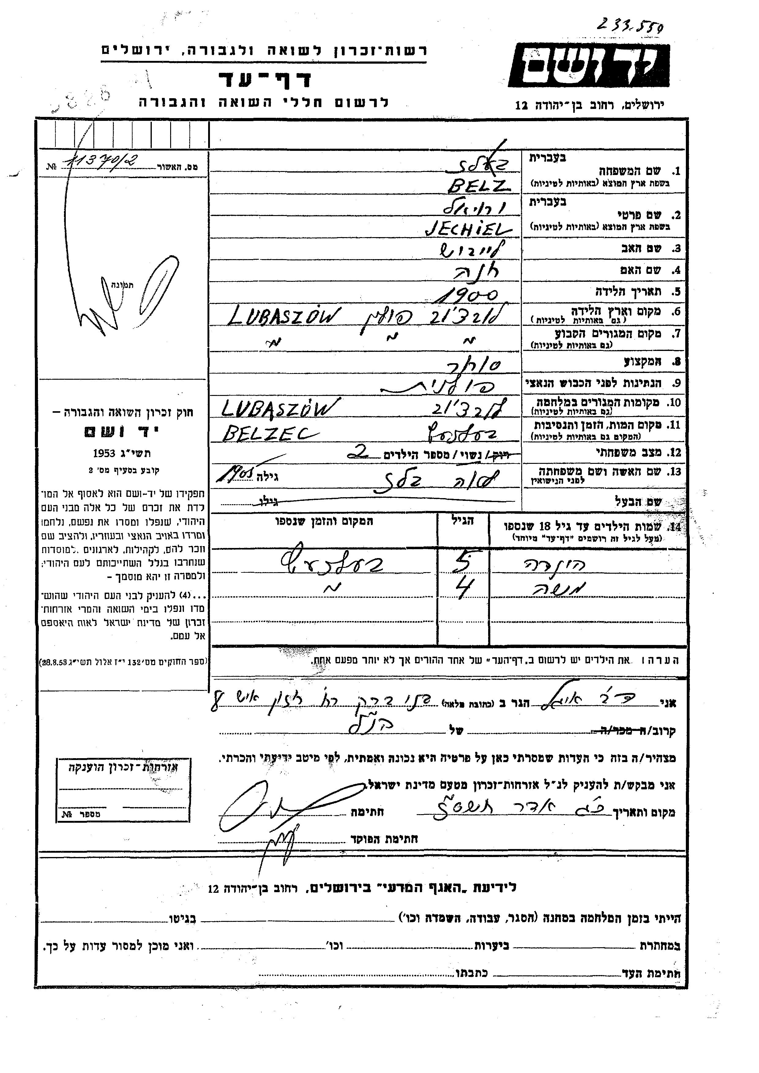 Белз Хинда Любашов, Польша Лист свидетельских показаний