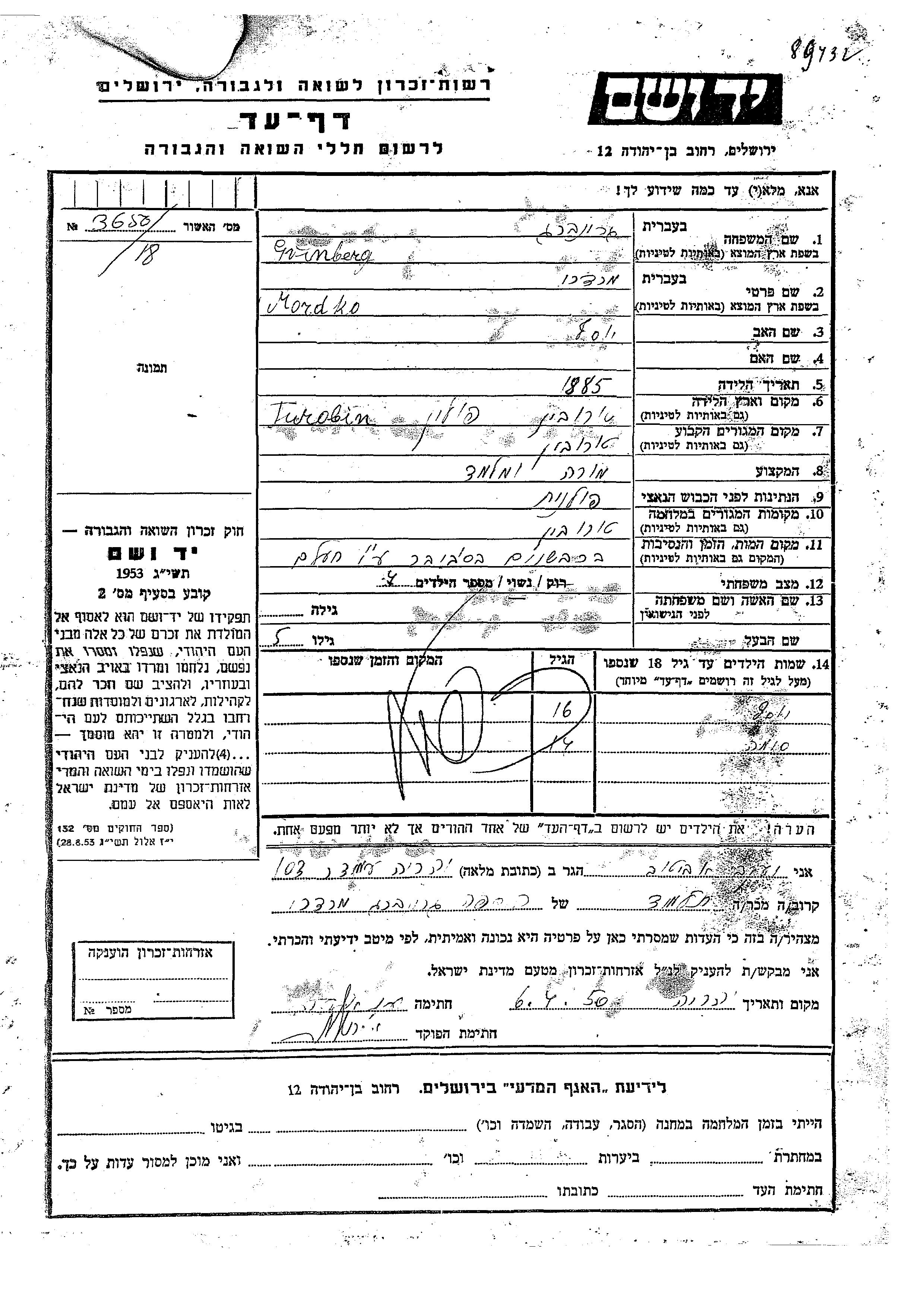 Яд Вашем - Листы свидетельских показаний Мемориального фонда