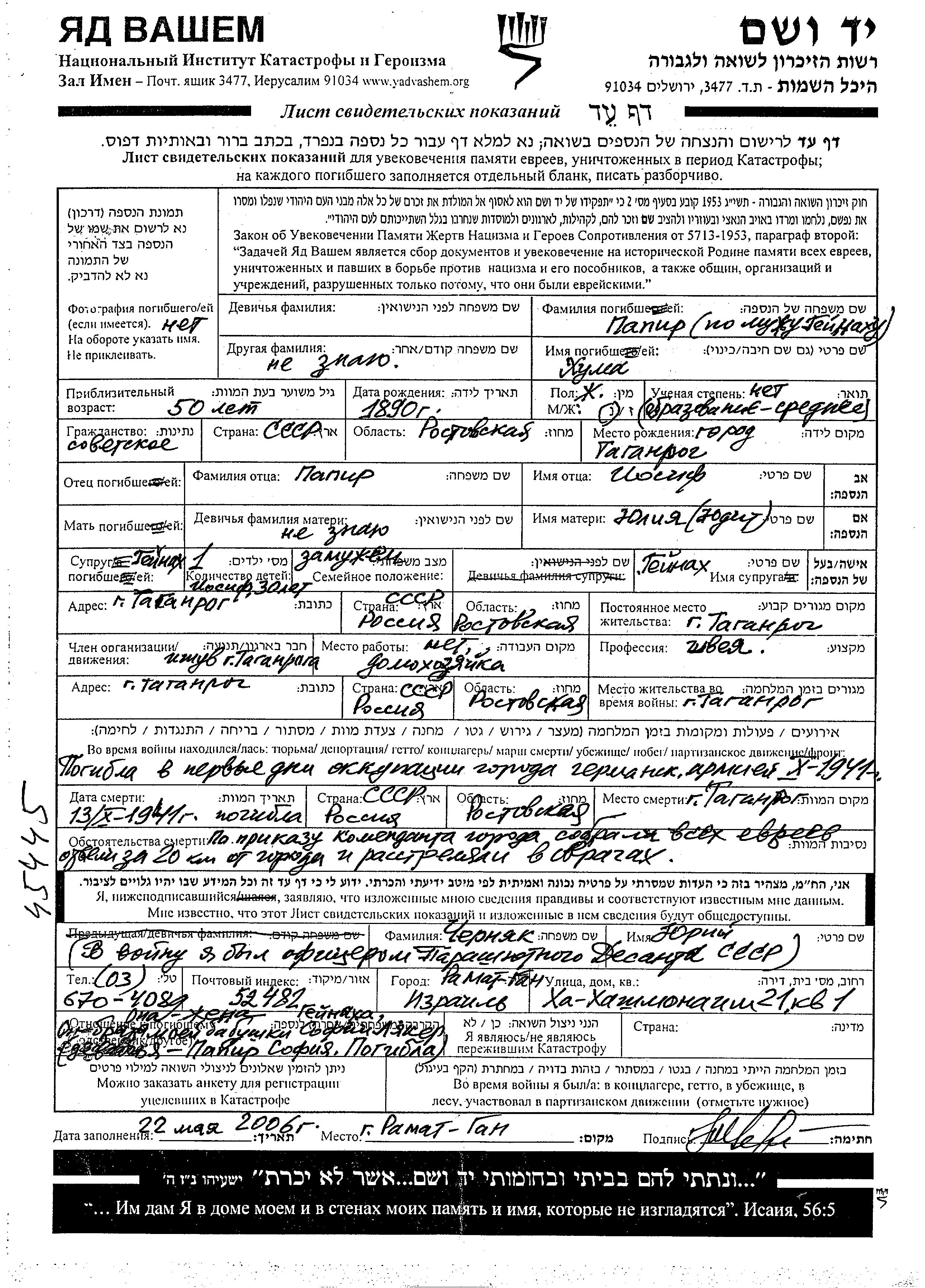 Яд Вашем - Листы свидетельских показаний Мемориального фонда