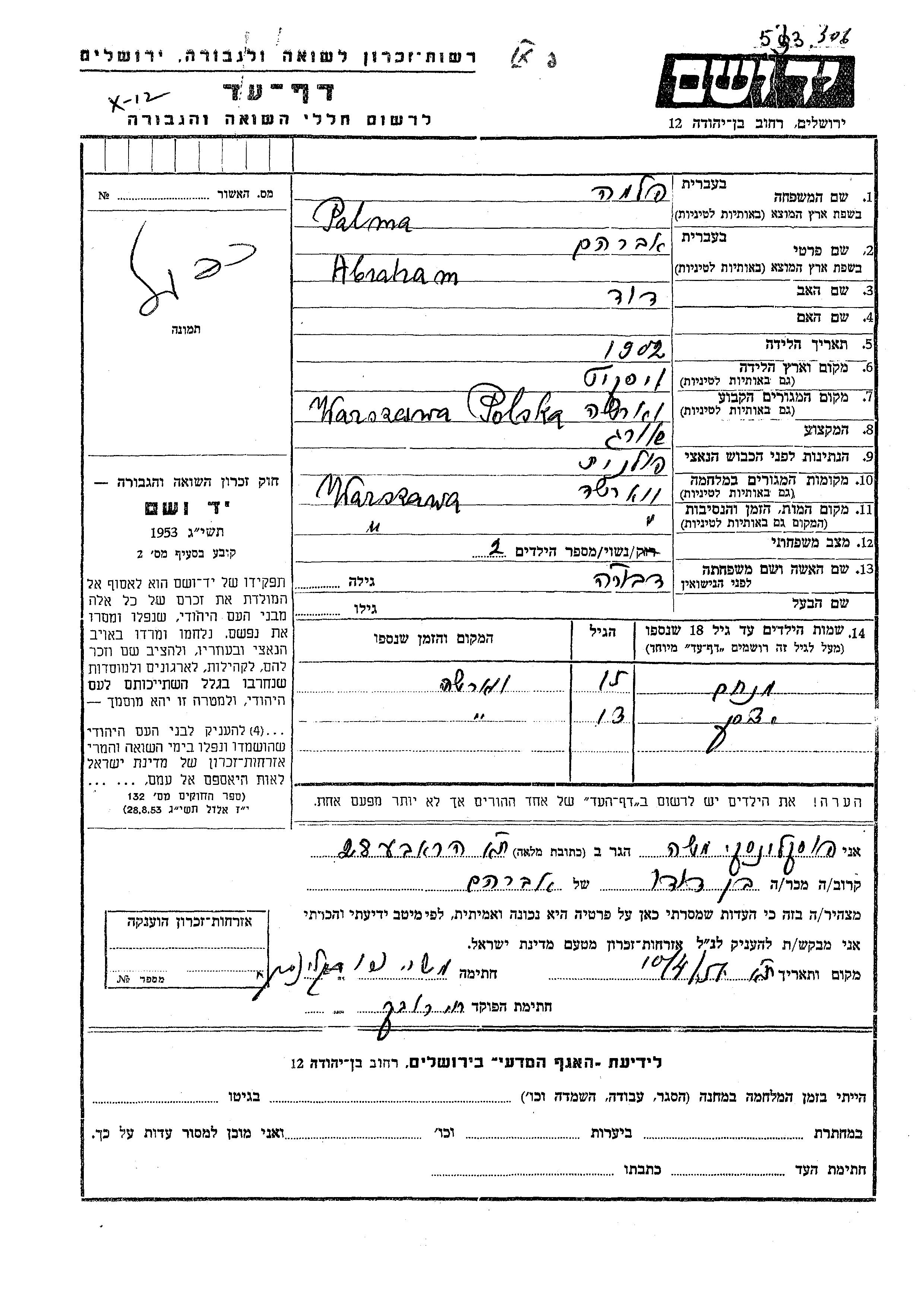 Пальма Менахем Варшава, Польша Лист свидетельских показаний
