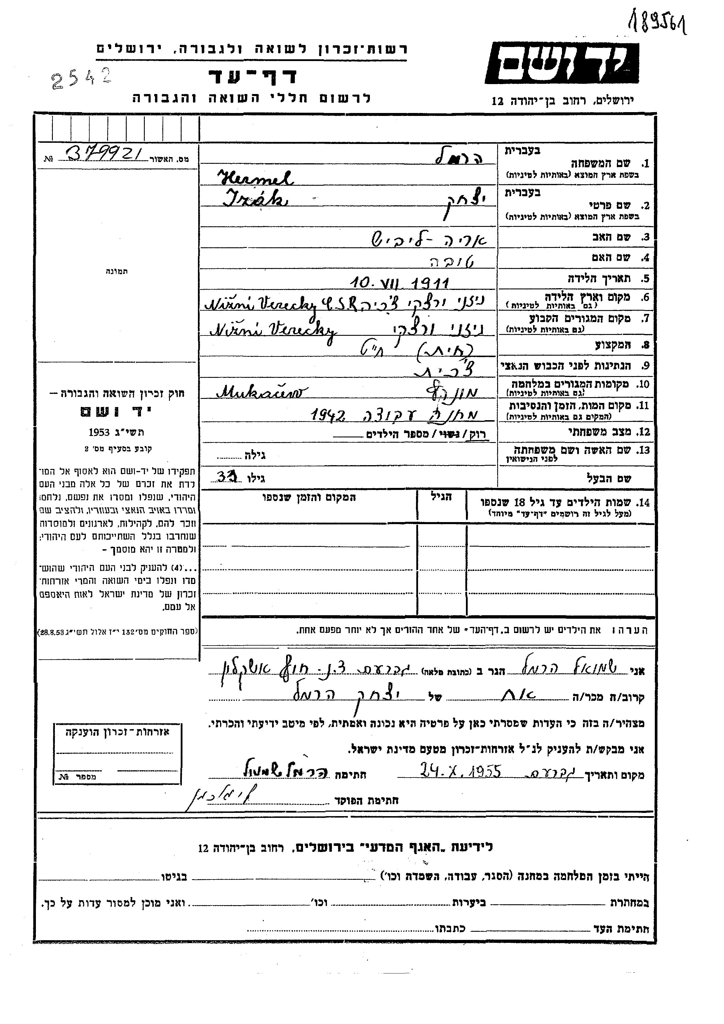 Хермель Изак 1911 Нижни Верецки, Чехословакия Лист свидетельских показаний