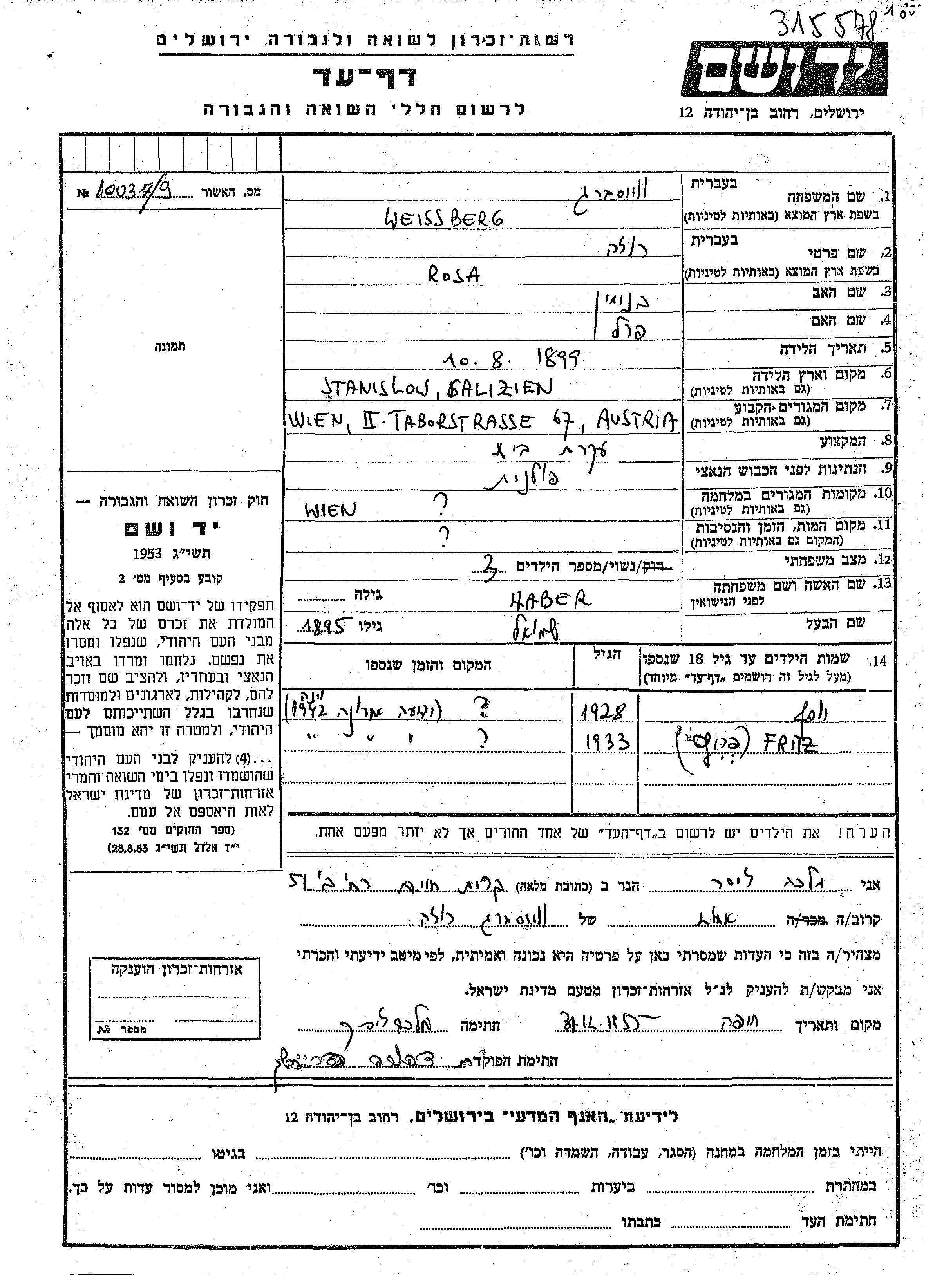 Вайссберг Фриц 1933 Вена, Австрия Лист свидетельских показаний