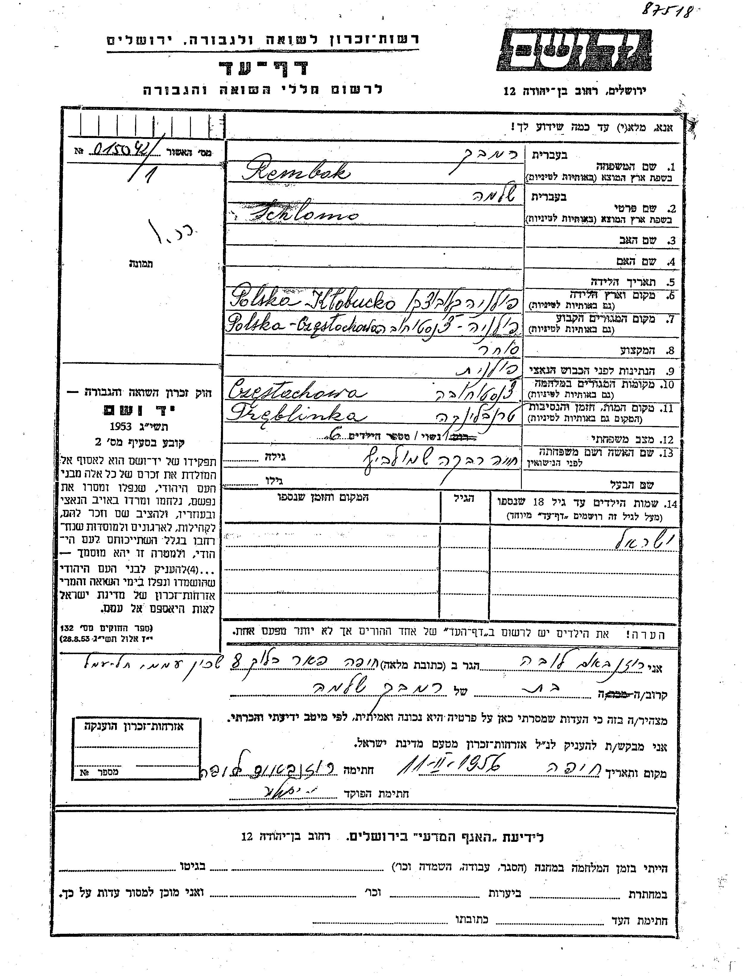 Рембак Исраэль Ченстохова, Польша Лист свидетельских показаний