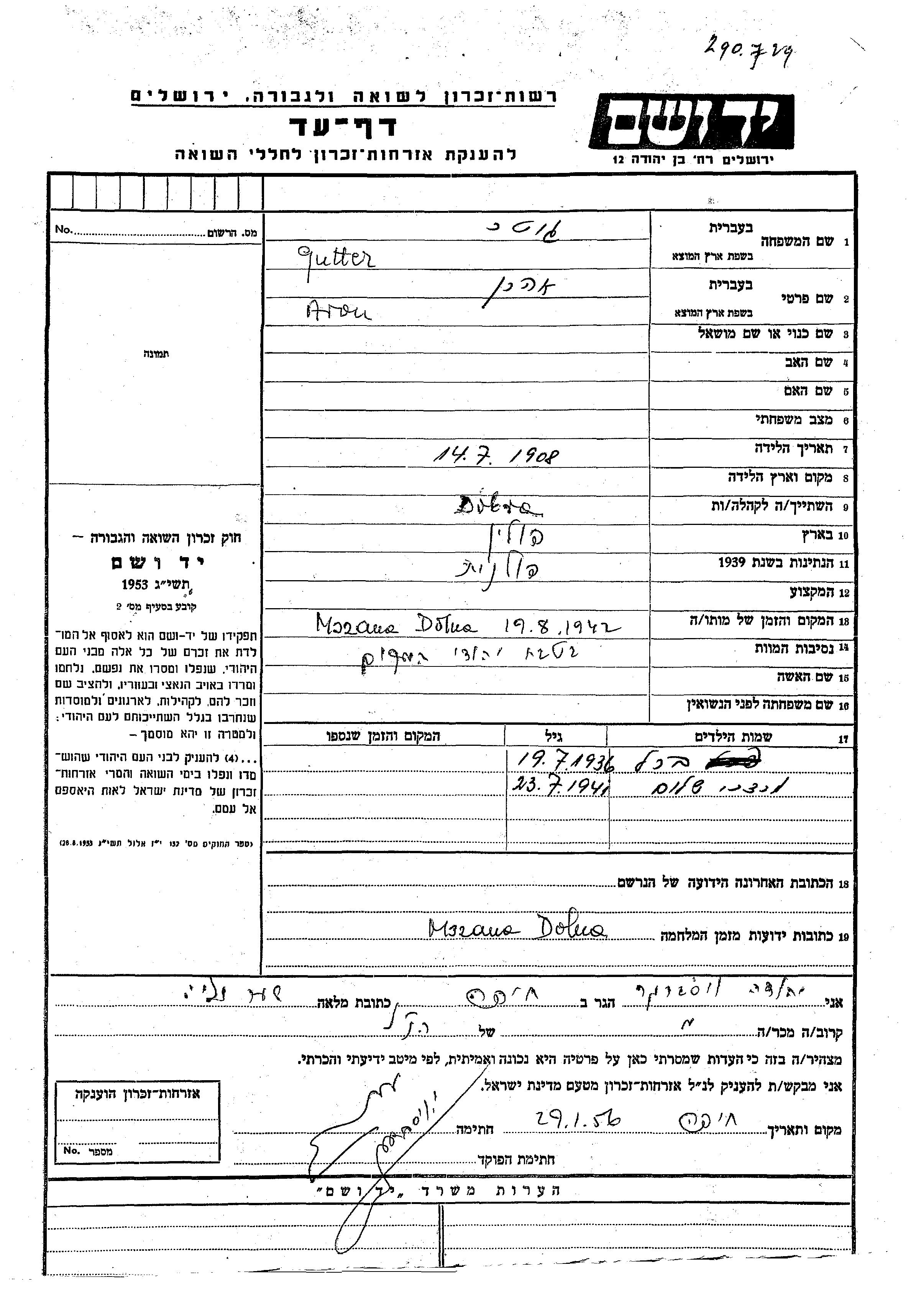 Гуттер Берл 1936 Добра, Польша Лист свидетельских показаний