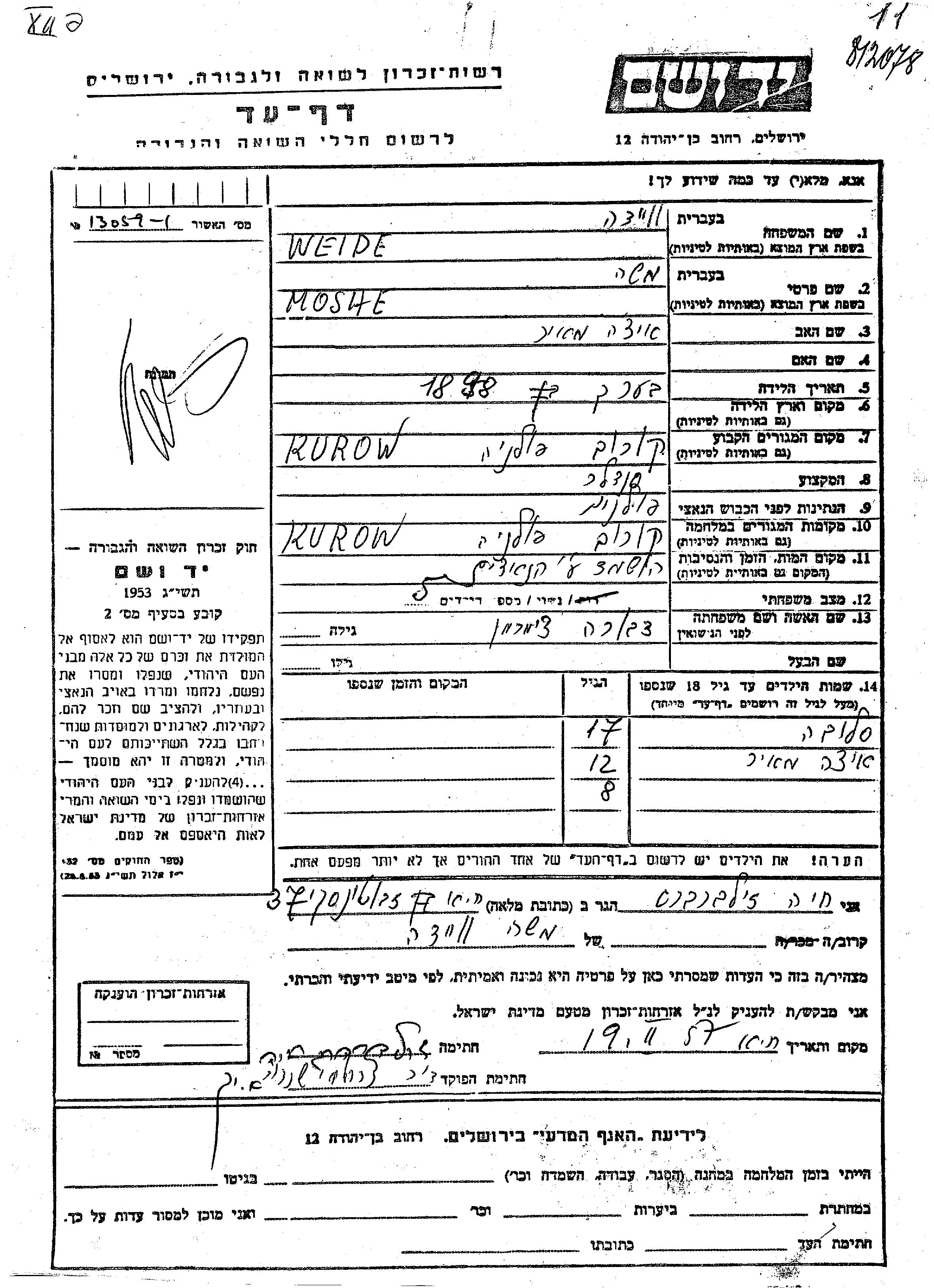 Иче Меир Вейде родился/родилась Моше Двора девичья фамилия Цимерман. Ребенок. Место жительства до войны: Курув, Польша. Место во время войны: Курув, Польша.
