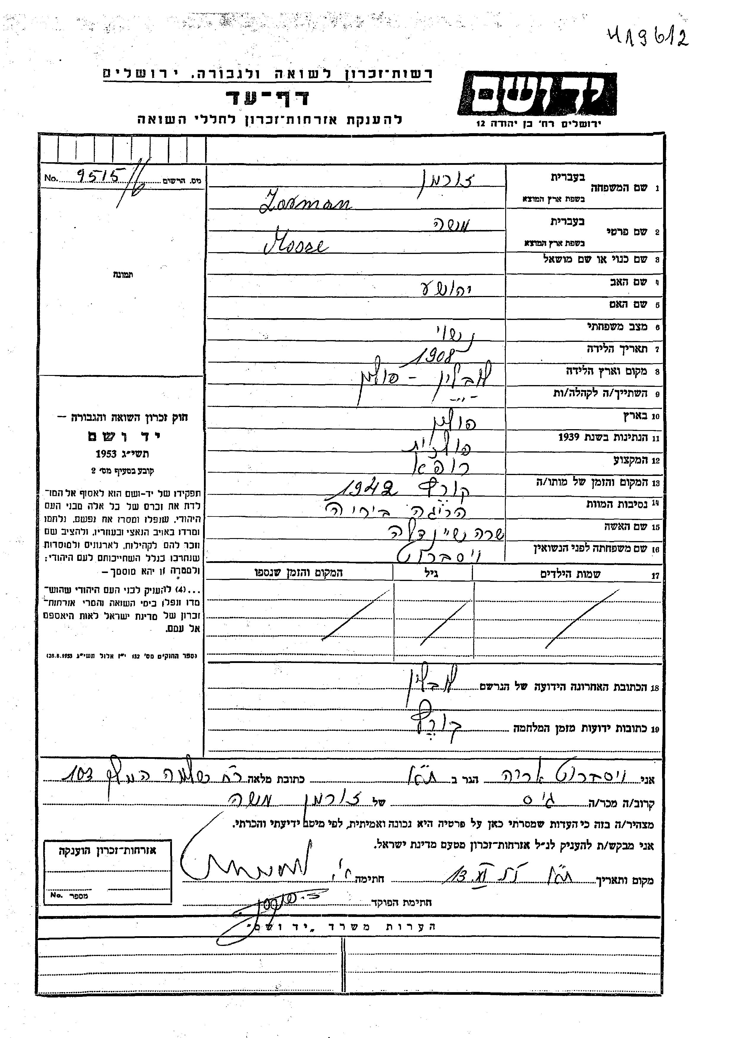 Моше Зорман, место рождения: Люблин, Польша. Отец: Иегошуа. Врач. Женат / замужем. Место жительства до войны: Люблин, Польша. Место во время войны: Корец, Польша.