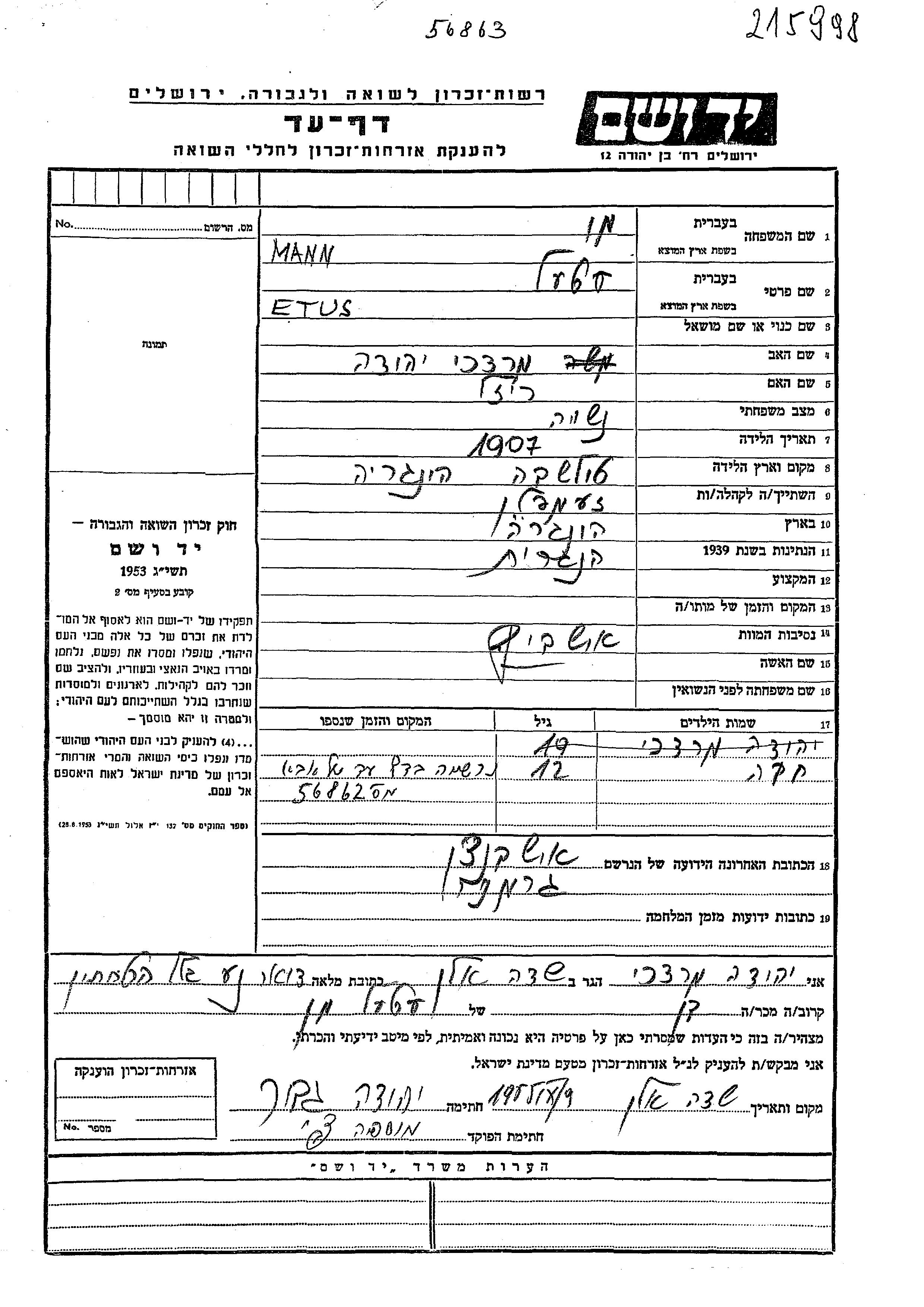 Этуш Манн, место рождения: Тольчва, Венгрия. Отец: Мордехай Иегуда, mать:Рейзел. Женат / замужем. Место жительства до войны: Велки Таркан, Чехословакия.