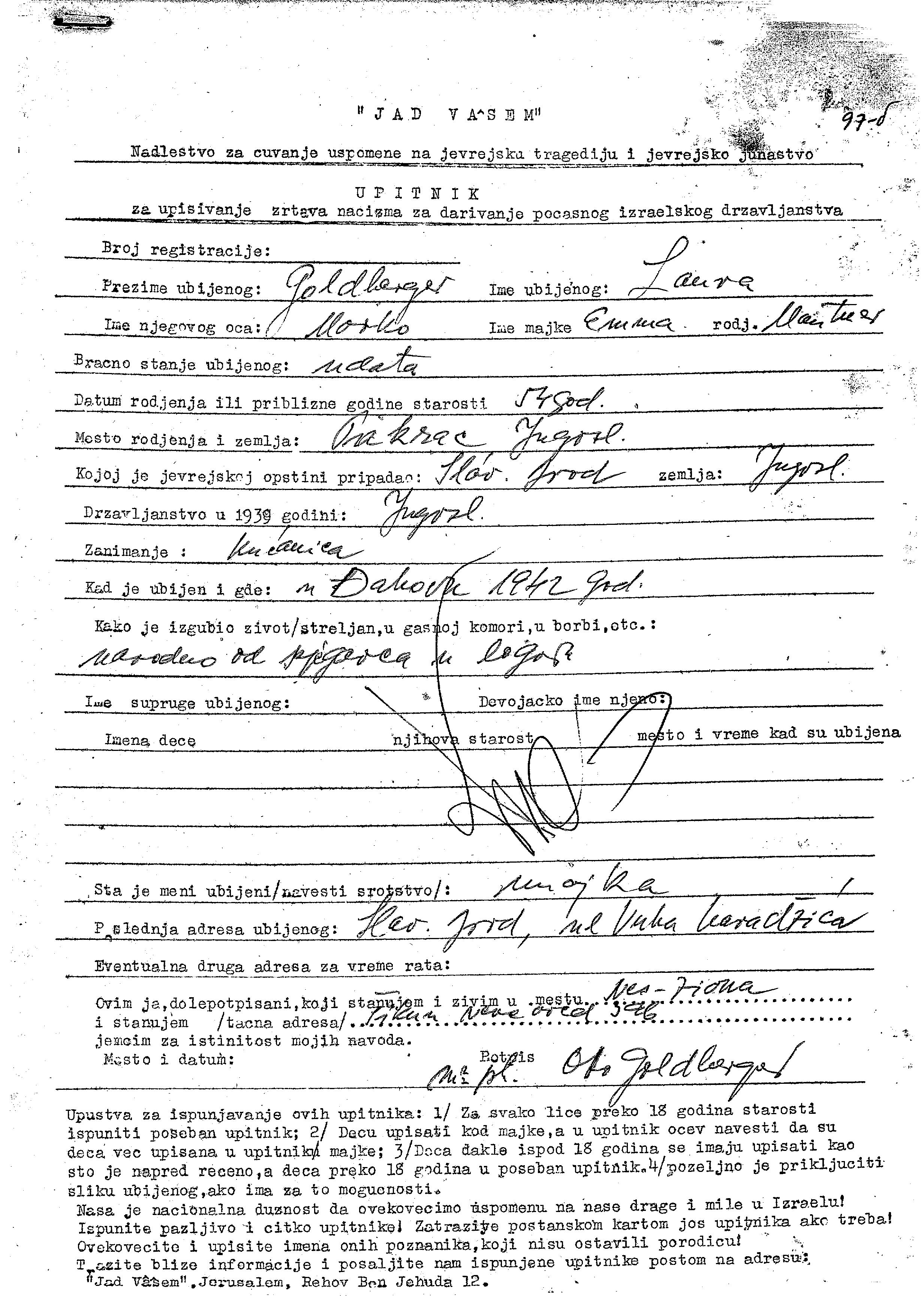 Гольдбергер Лаура Славонский-Брод, Югославия Лист свидетельских показаний
