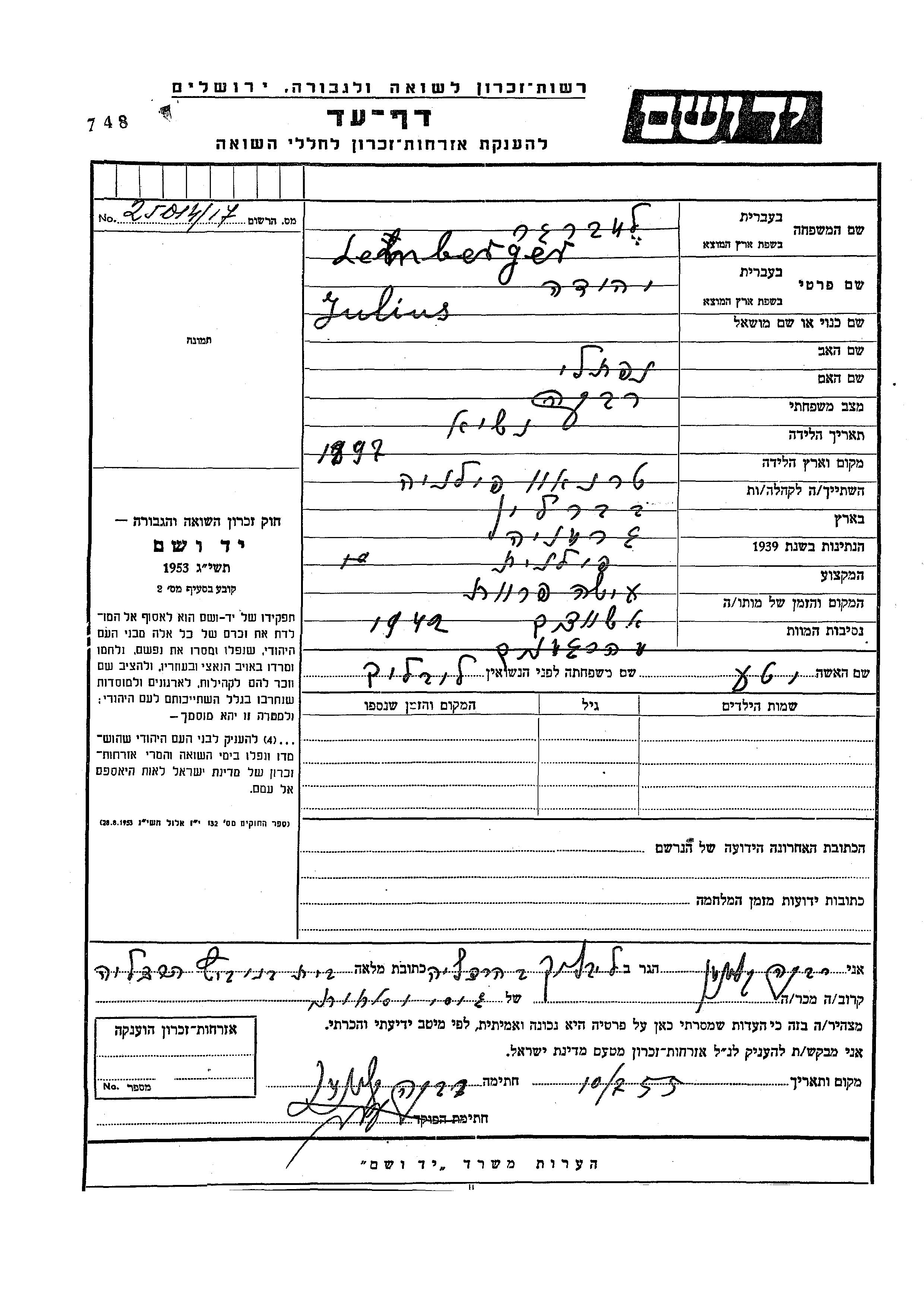 Лембергер Юлиус Иегуда 1897 место не указано, Лист свидетельских показаний