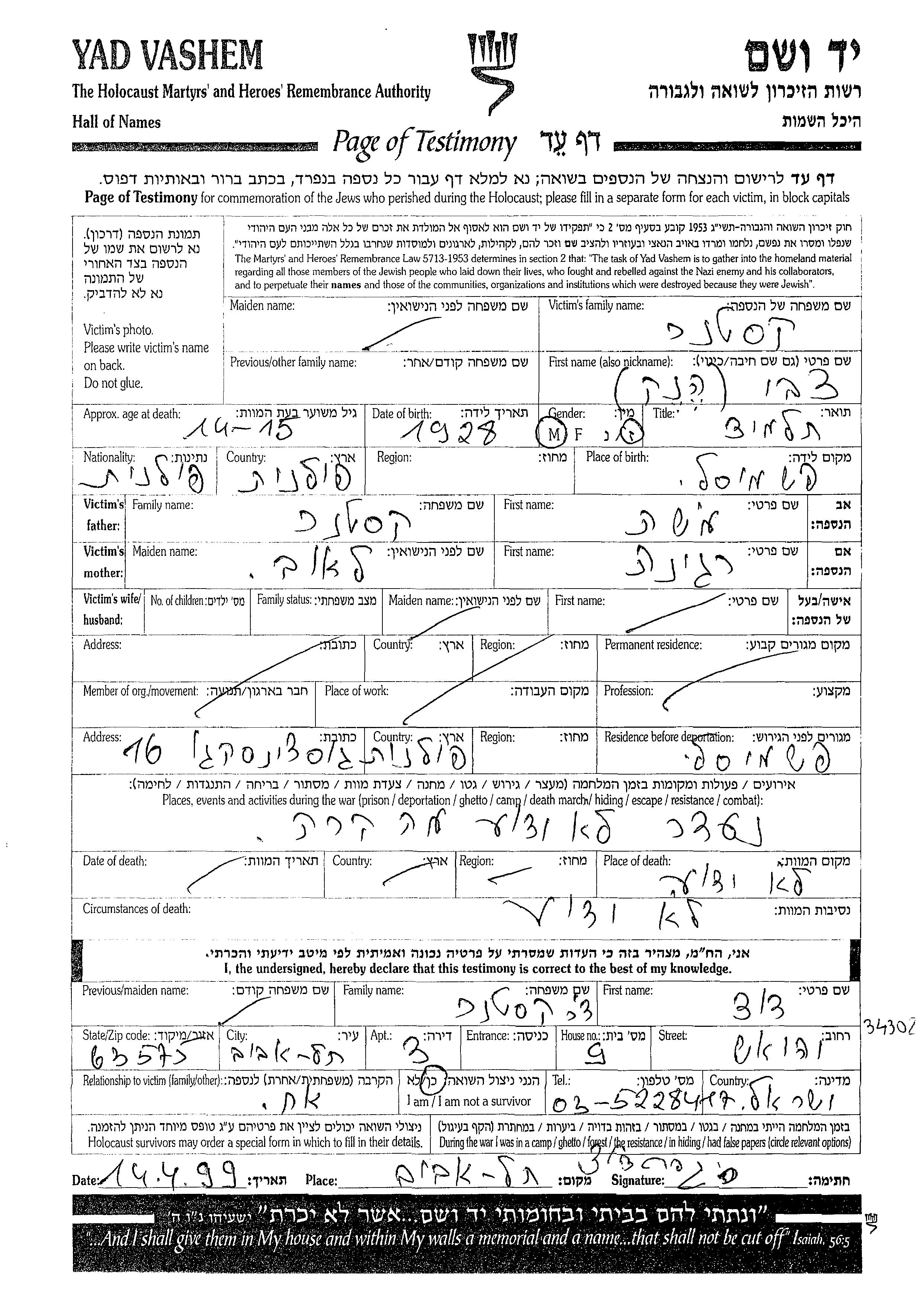Кастнер Цви Хенек 1928 место не указано, Лист свидетельских показаний