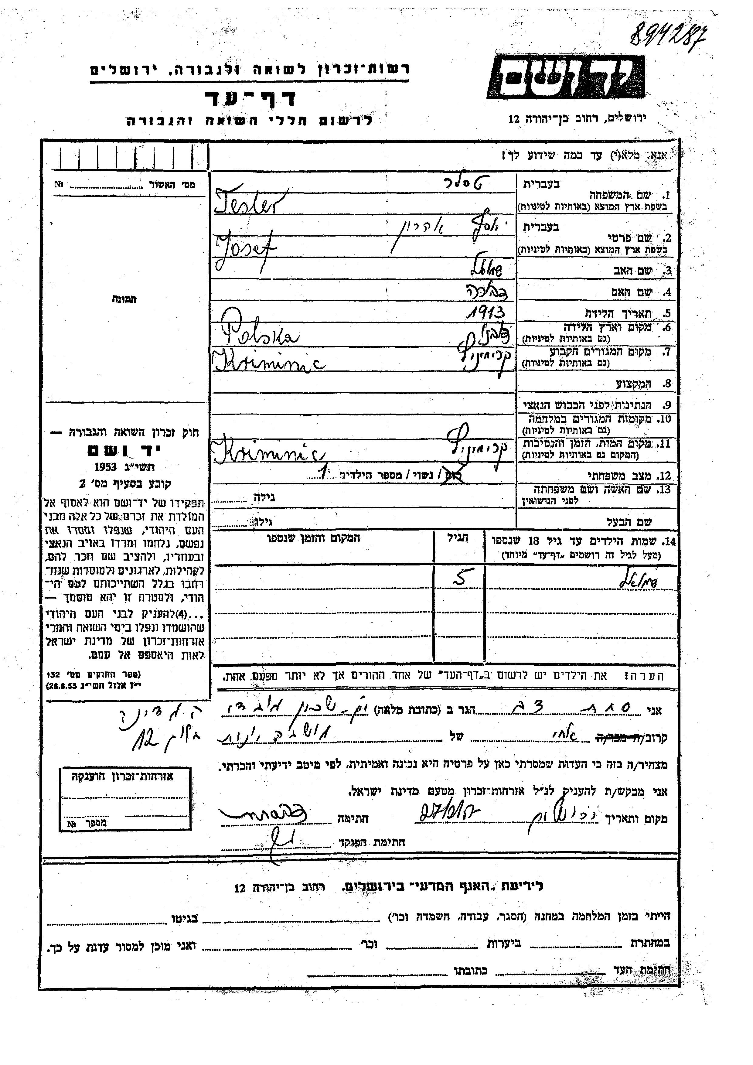 Теслер Шмуэль Кременец, Польша Лист свидетельских показаний