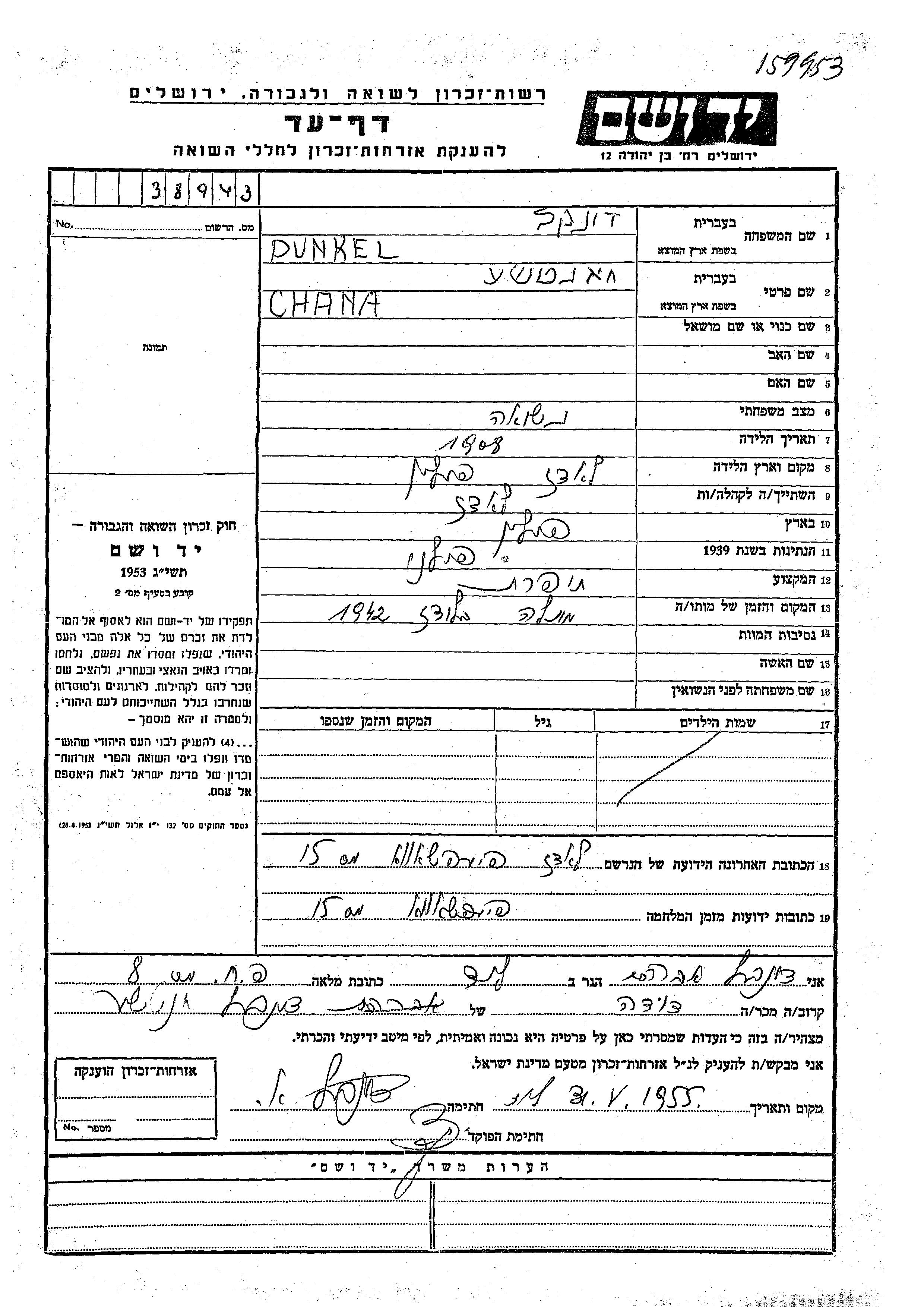 Дункель Хана 1908 Лодзь, Польша Лист свидетельских показаний