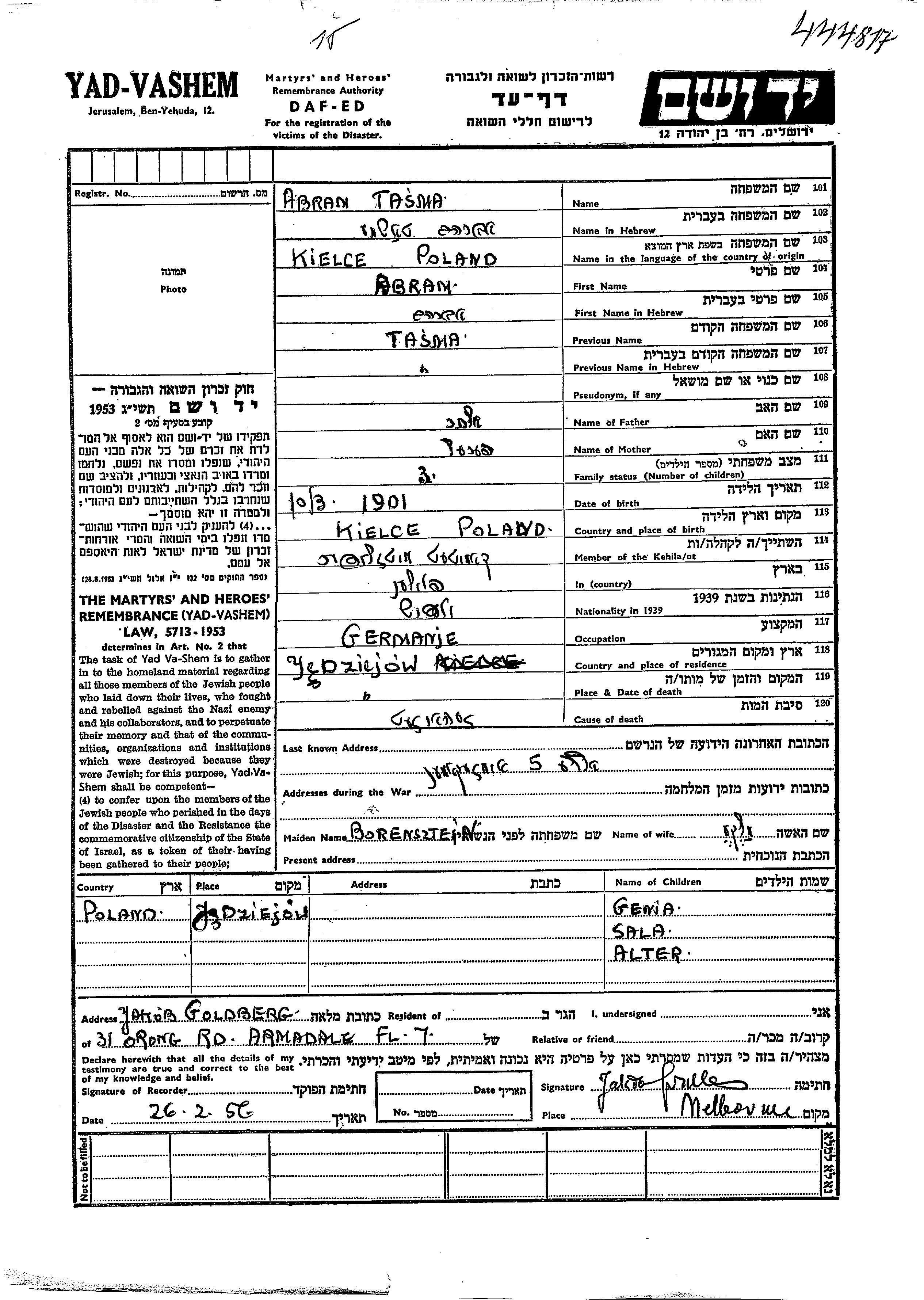 Яд Вашем - Листы свидетельских показаний Мемориального фонда