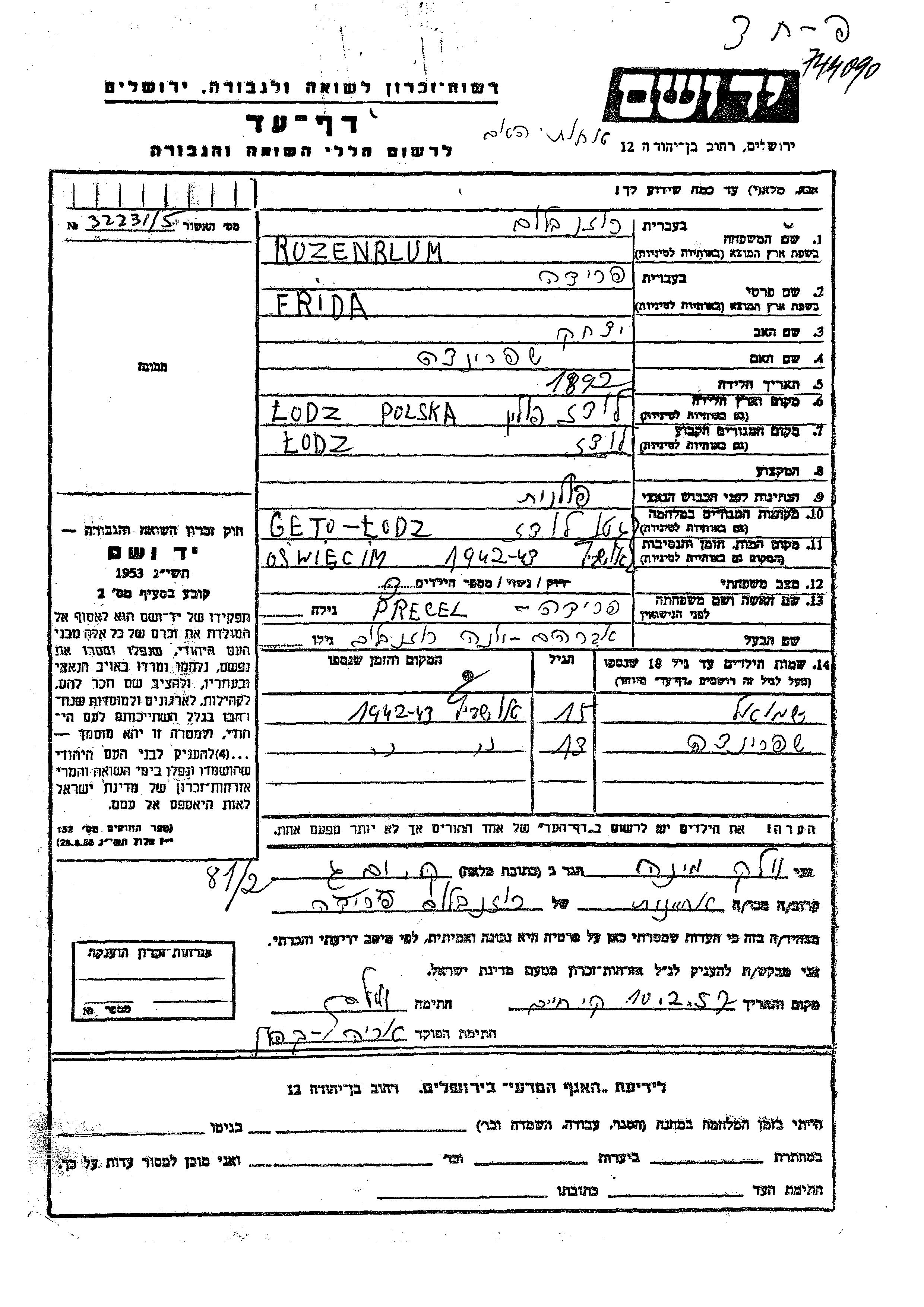 Розенблюм Шпринца Лодзь, Польша Лист свидетельских показаний