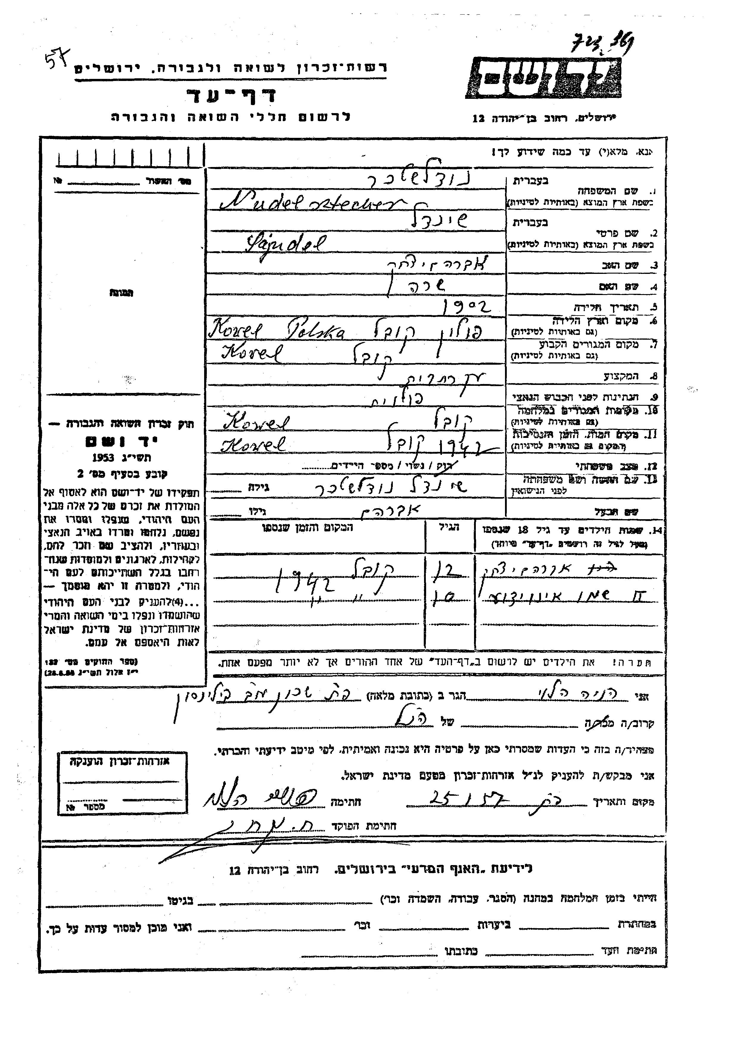 Нудельштехер Имя неизвестно Коваль, Польша Лист свидетельских показаний