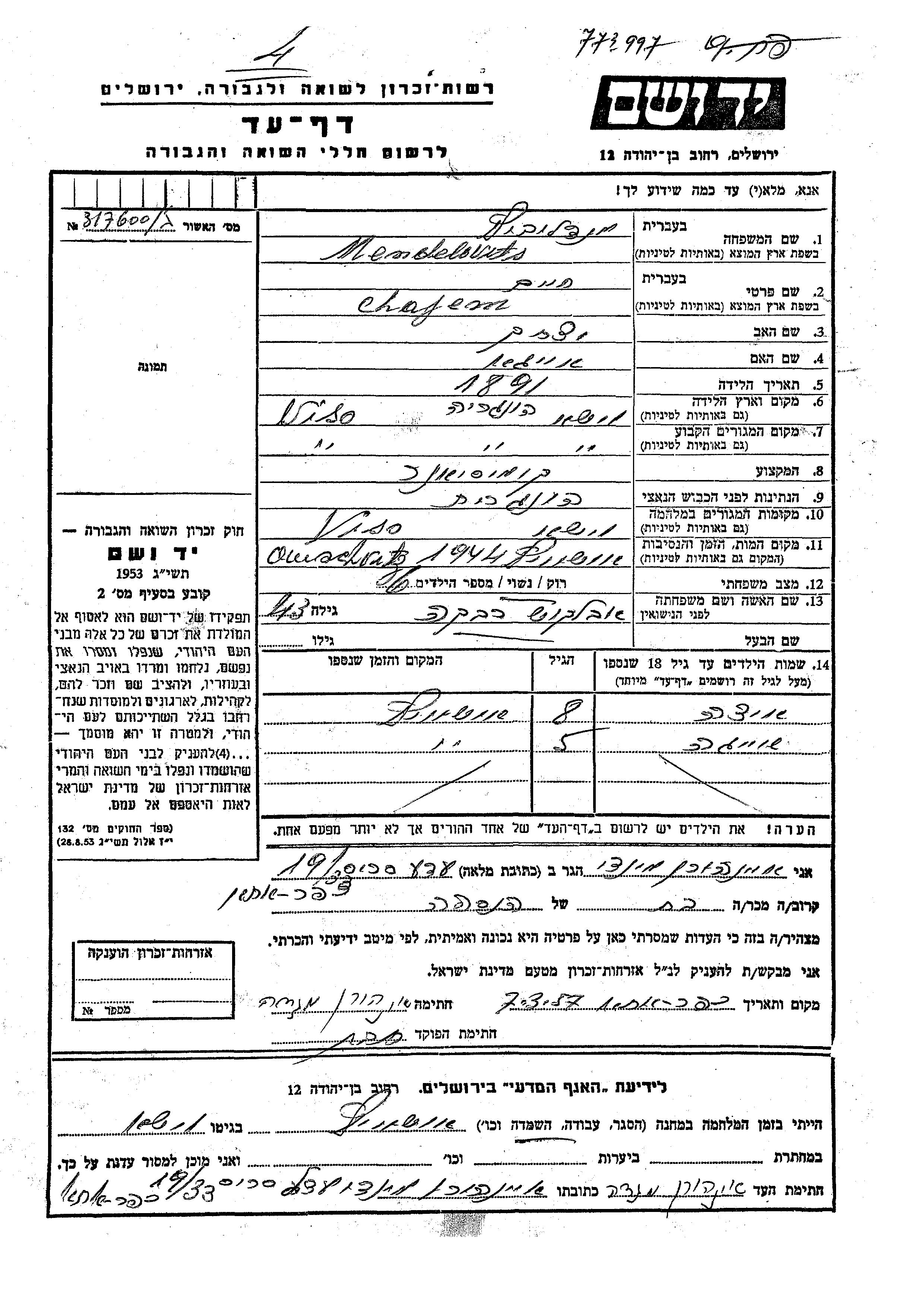 Яд Вашем - Листы свидетельских показаний Мемориального фонда
