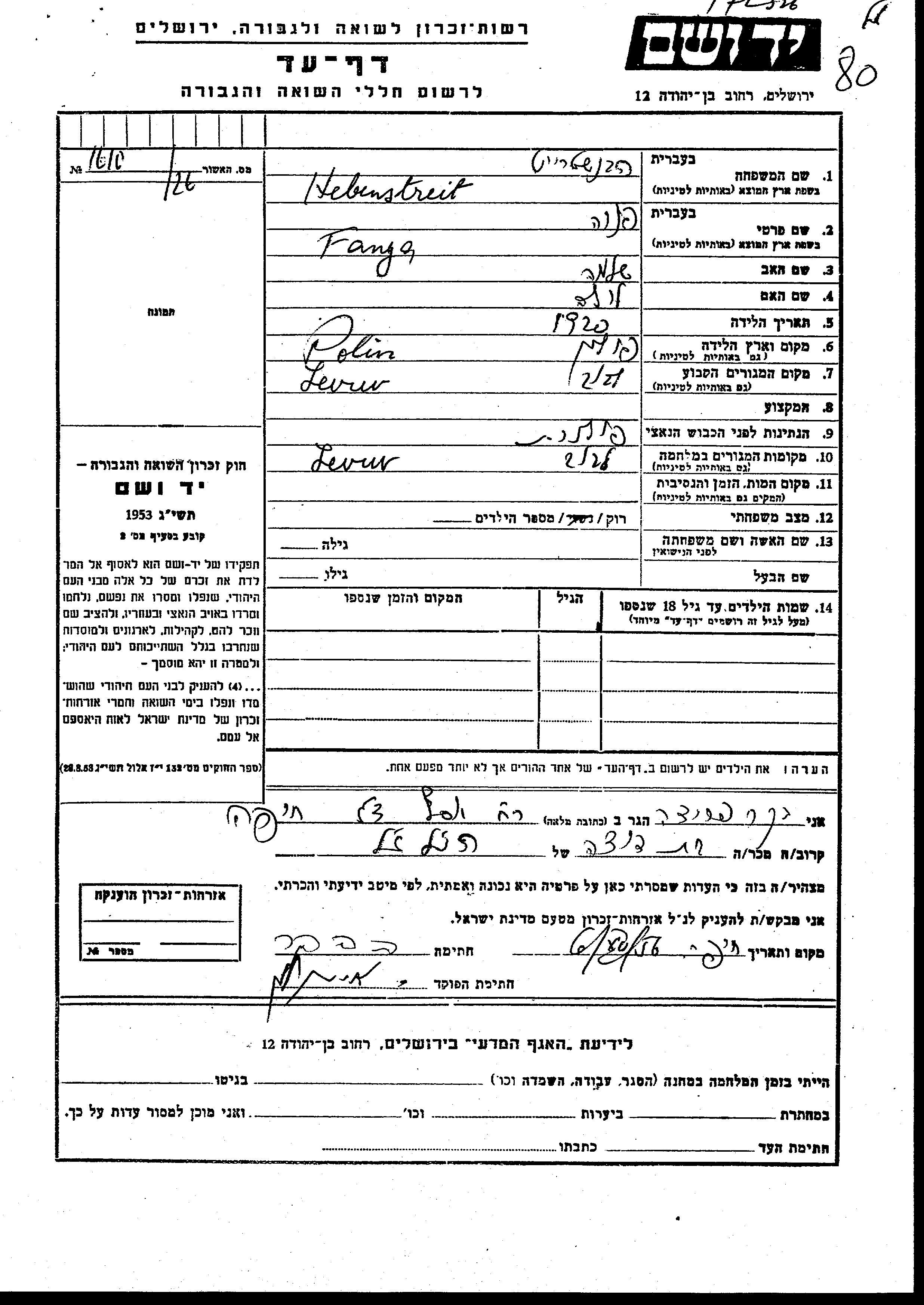 Фаня Хебенштрайт, место рождения: Польша. Отец: Шломо, mать:Лола. Место жительства до войны: Львов, Польша. Место во время войны: Львов, Польша.
