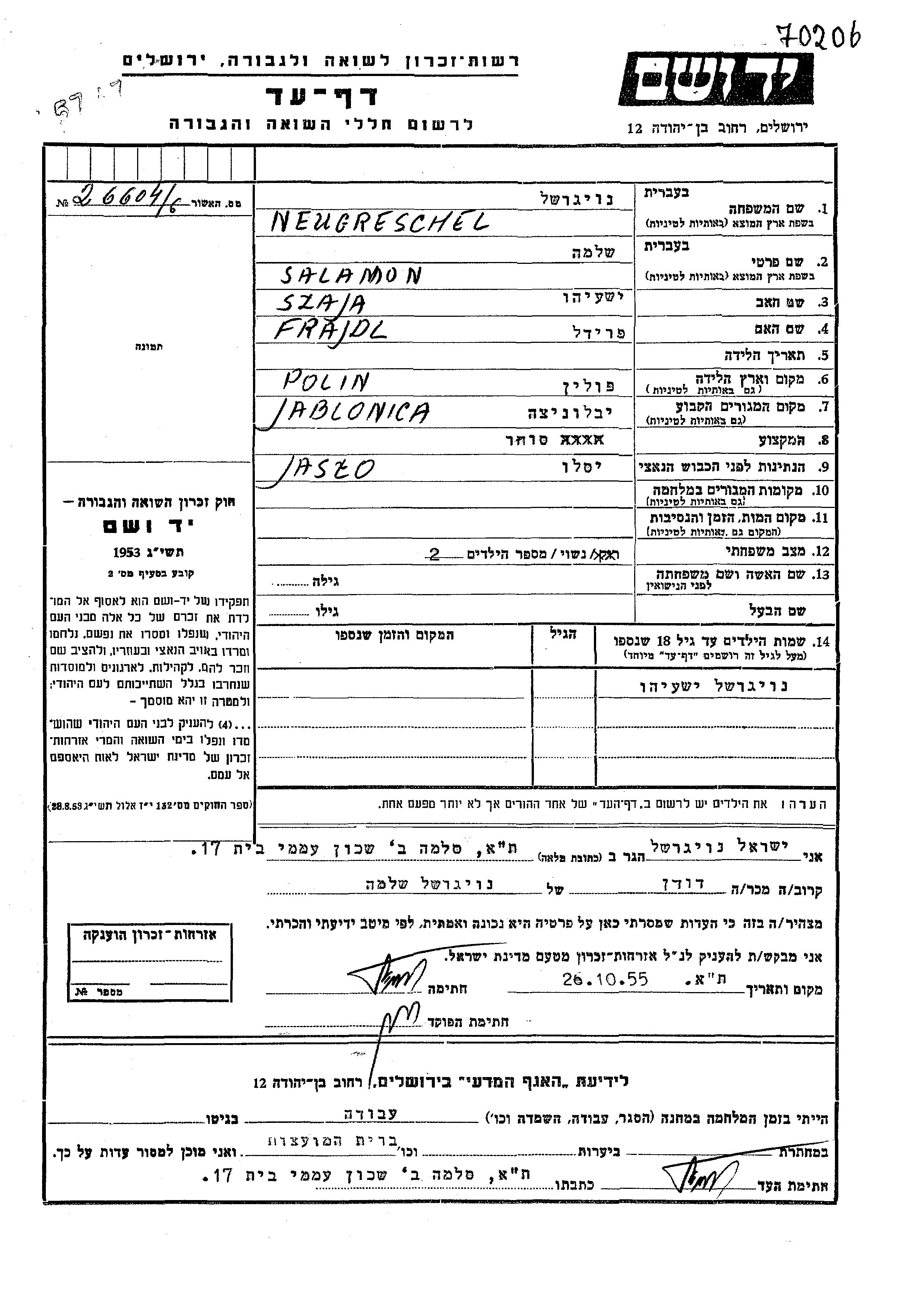 Нойгрешель Иешаягу Яблоница, Польша Лист свидетельских показаний