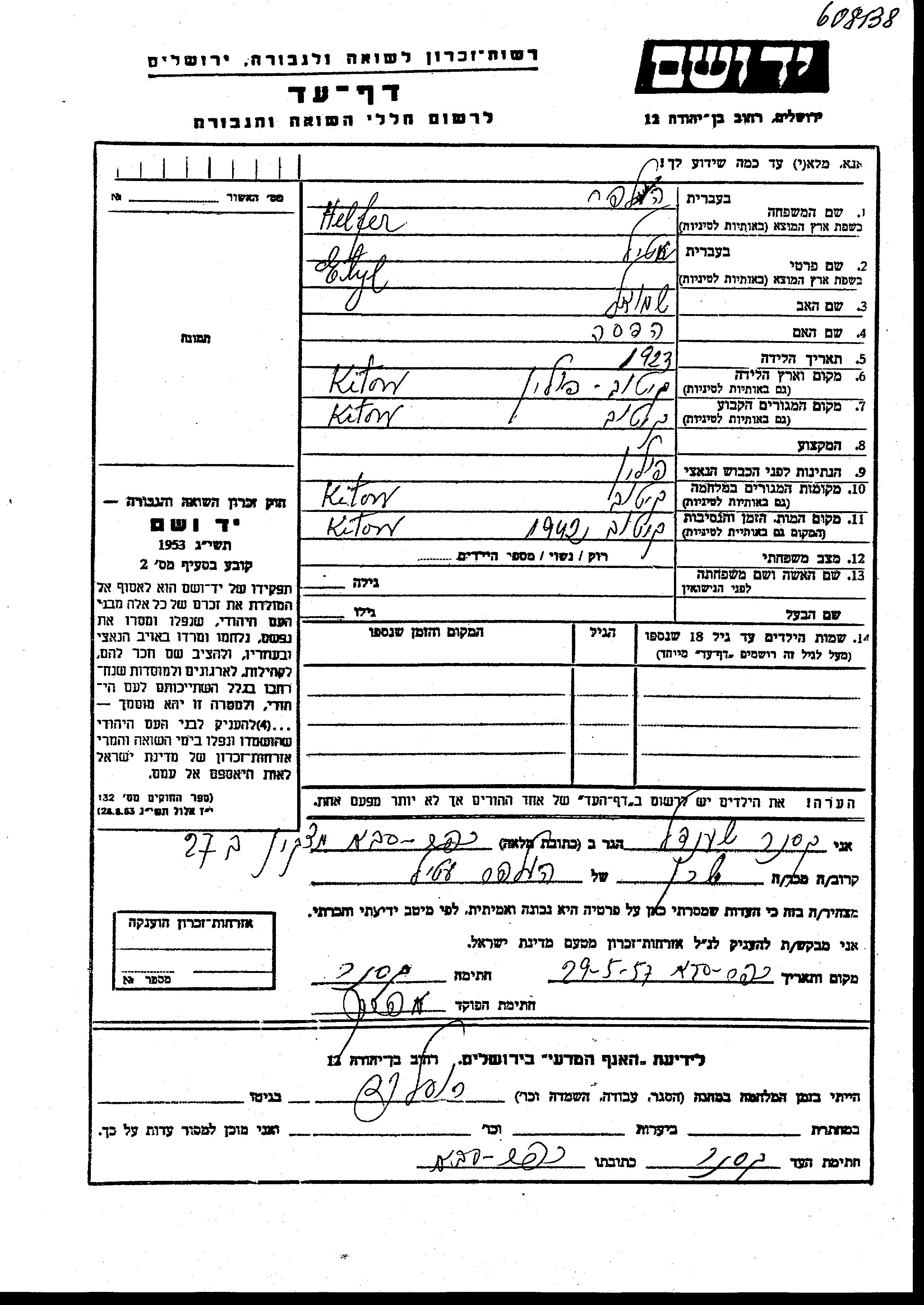 Хельфер Халпер Этил 1923 Китув, Польша Лист свидетельских показаний