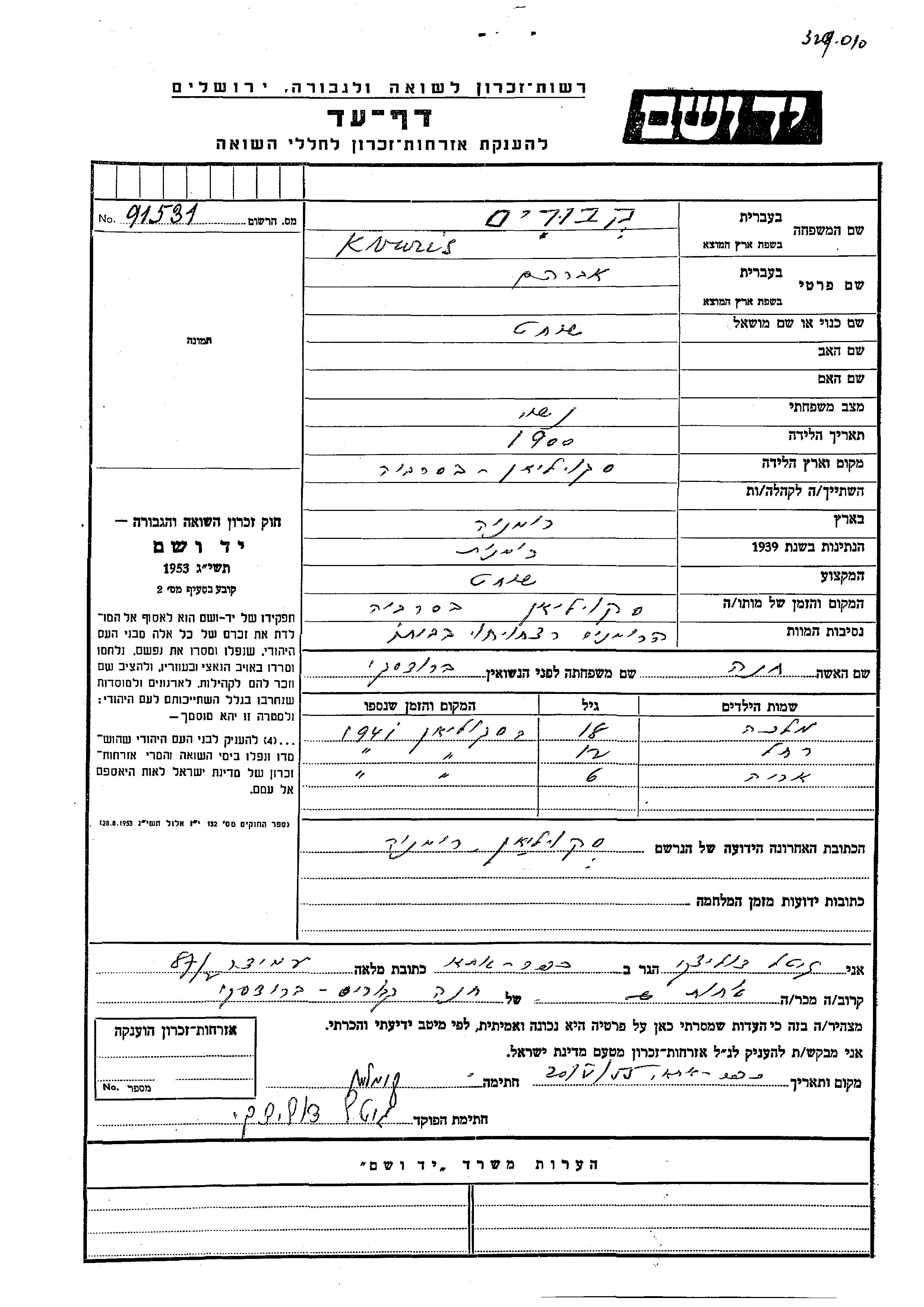 Арье Квурис Авраам Хана девичья фамилия Бродски. Ребенок. Место жительства до войны: Румыния. Место во время войны: Скуляны Тарг, Румыния.