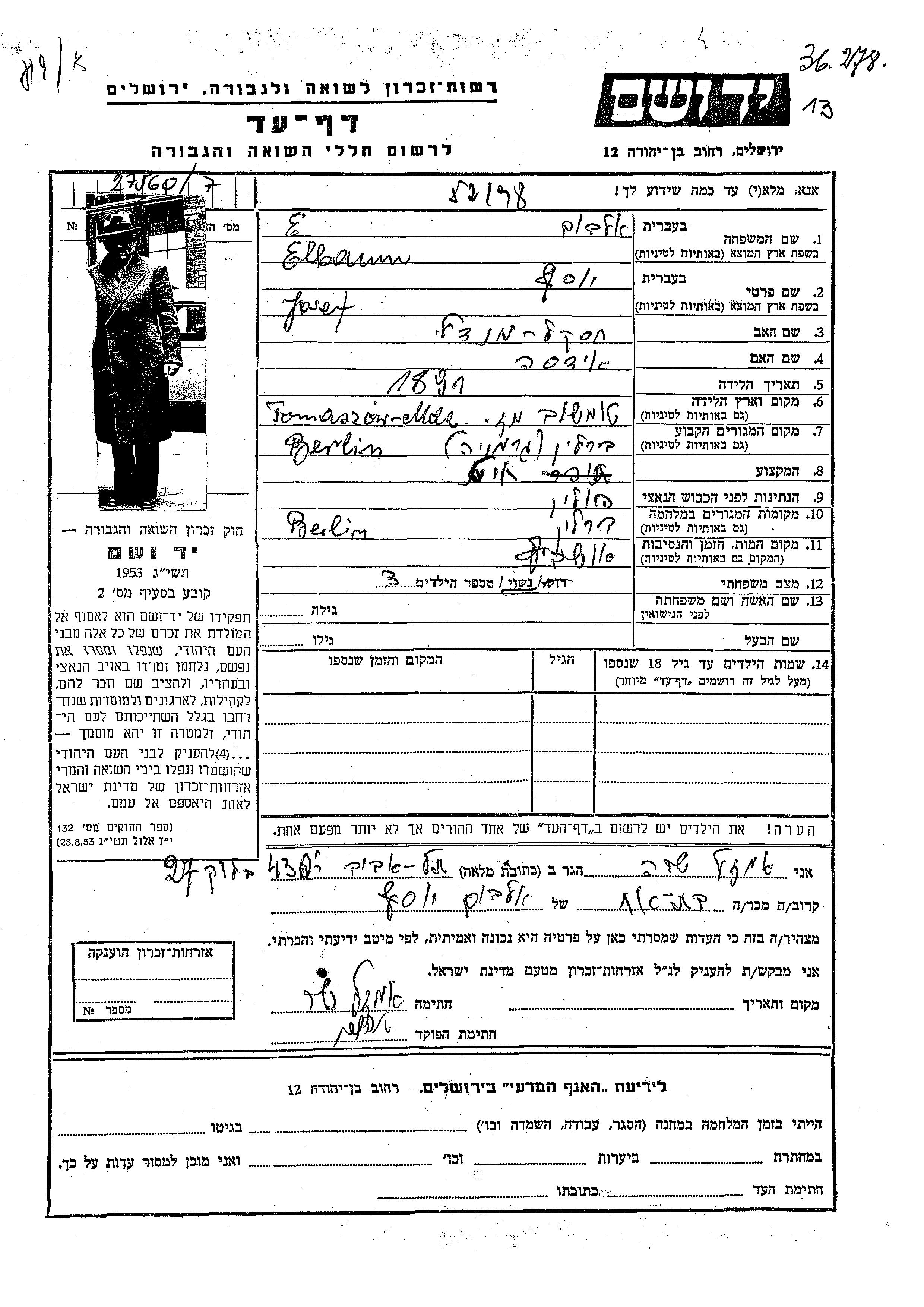 Йосеф Эльбаум Альбум, место рождения: Томашув-Мазовецки, Польша. Отец: Хаскель Мендель, mать:Идесса. Портной / портниха. Женат / замужем. Место жительства до войны: Берлин, Германия. Место во время войны: Берлин, Германия.