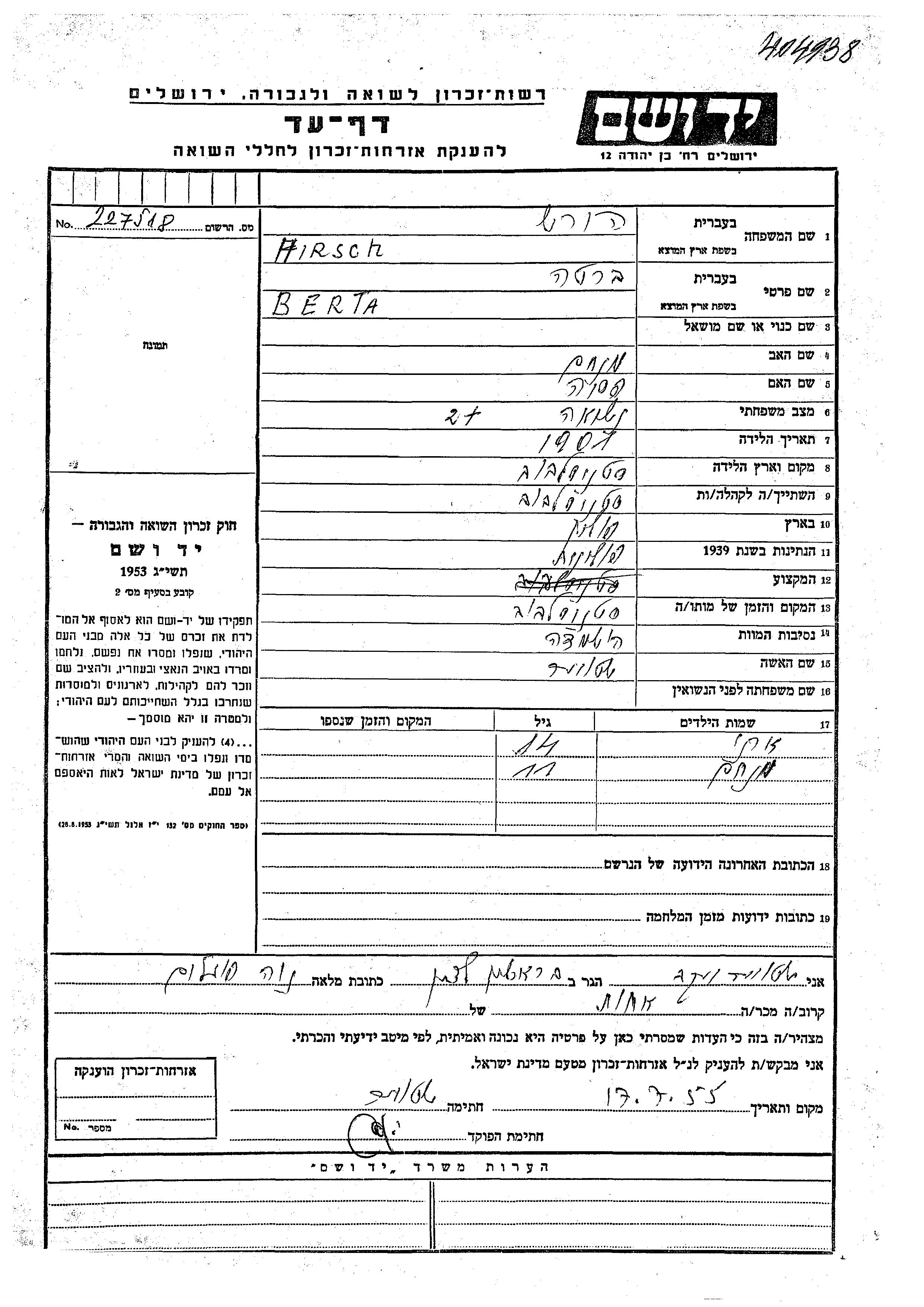 Хирш Менахем место не указано, Лист свидетельских показаний