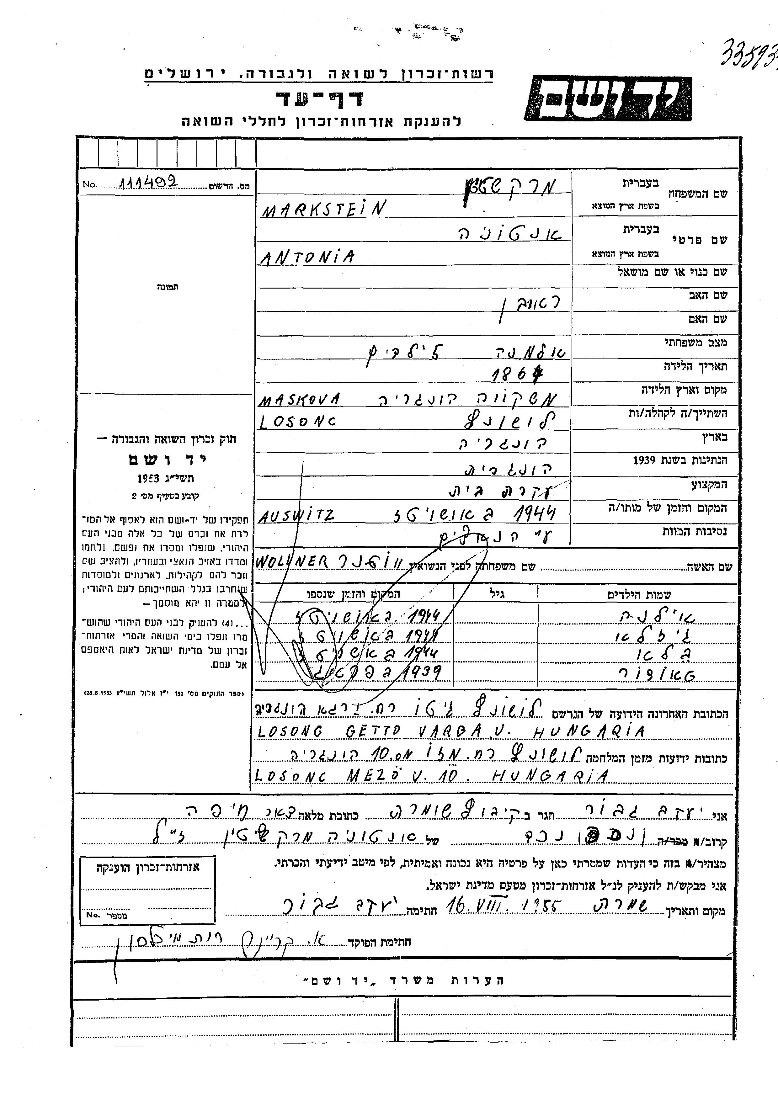 Теодор Маркштейн Антония девичья фамилия Волльнер. Ребенок. Место жительства до войны: Лошонц, Чехословакия. Место во время войны: Лошонц, Чехословакия.
