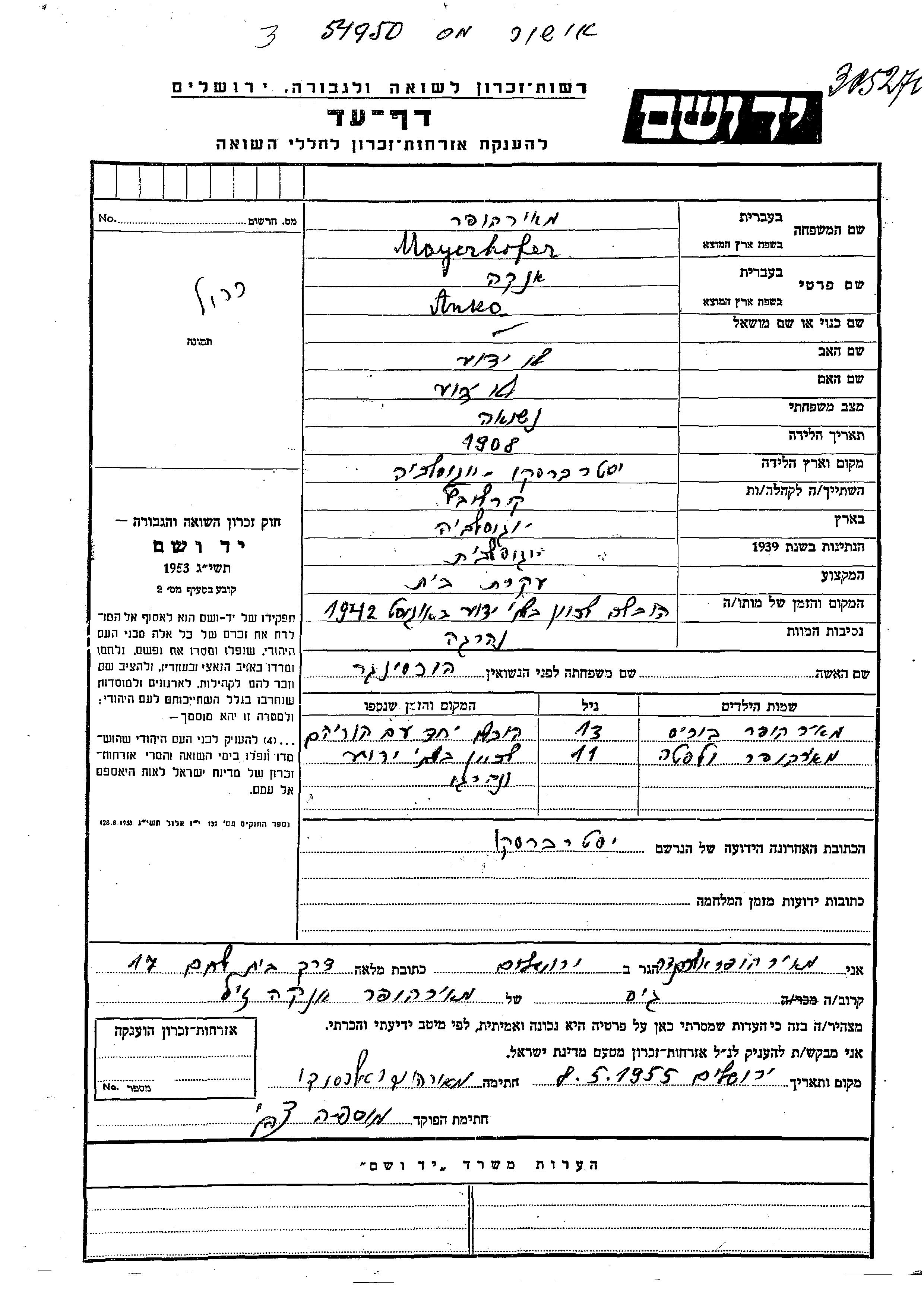 Борис Майерхофер Анка девичья фамилия Хохзингер. Ребенок. Место жительства до войны: Карловач, Югославия. Место во время войны: Ястребарско, Югославия.