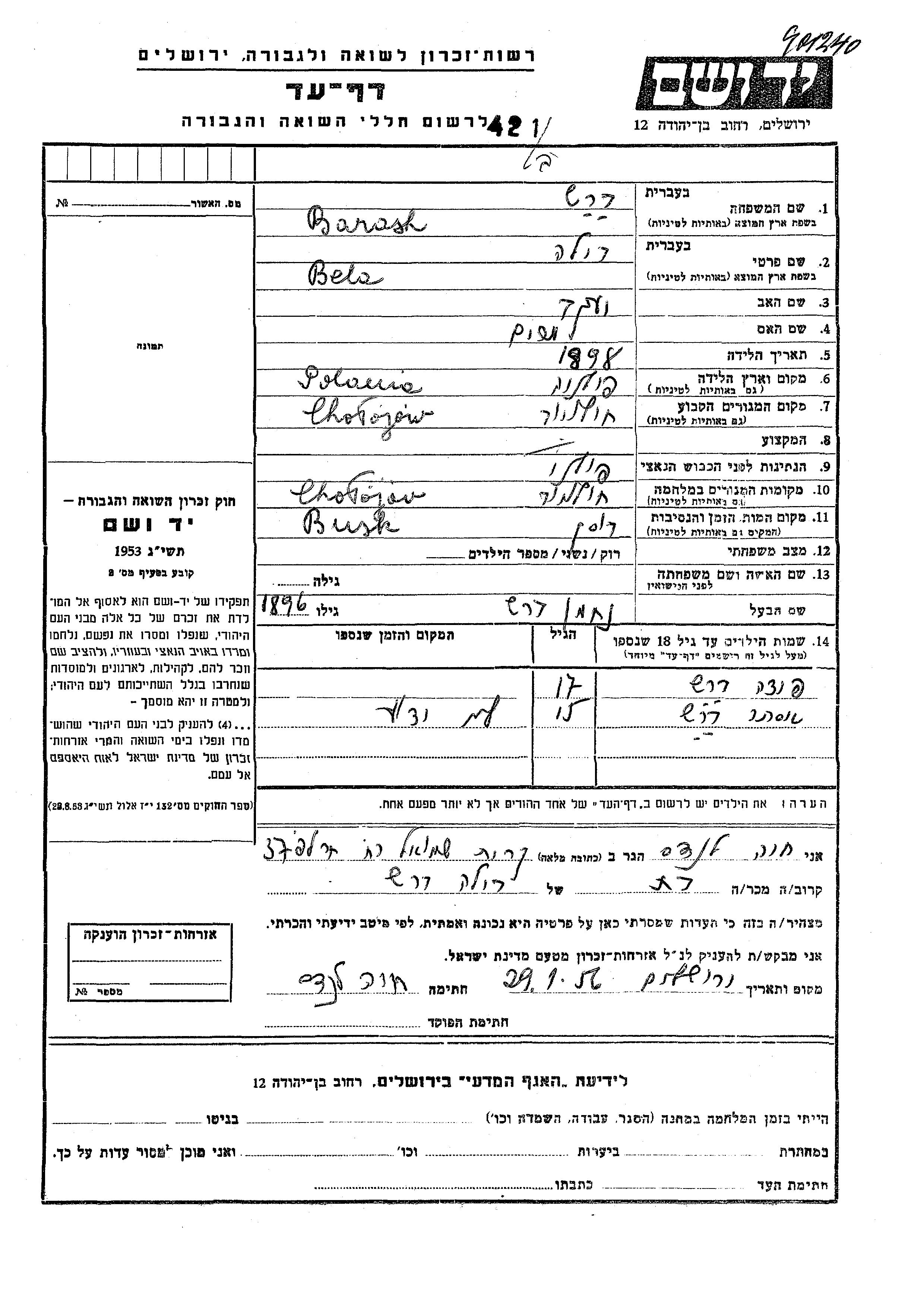 Бараш Фида Холоёв, Польша Лист свидетельских показаний