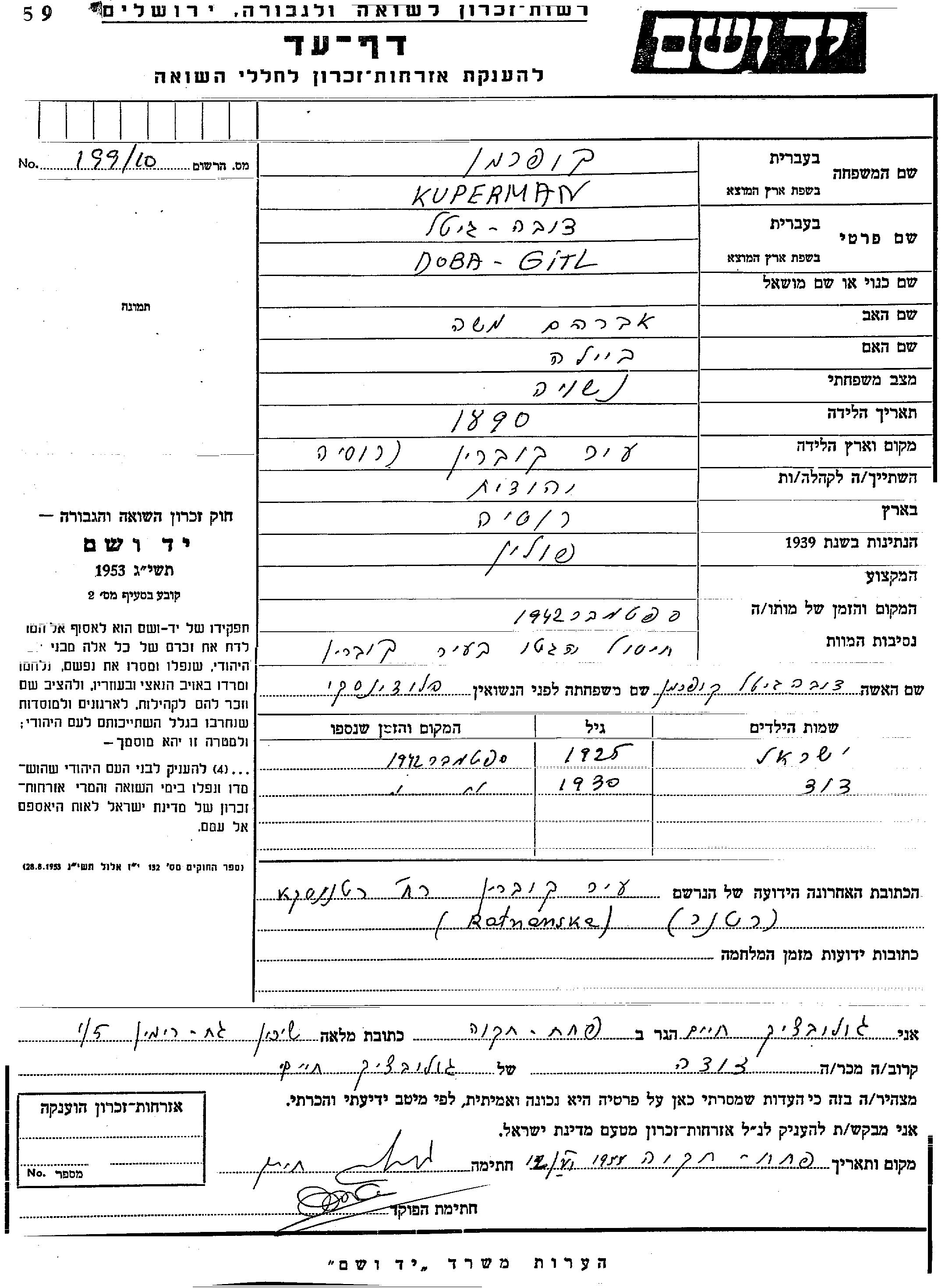 Исраэль Куперман. Mать:Доба Гитл, девичья фамилия Плочински. Ребенок. Место жительства до войны: Россия (СССР). Место во время войны: Кобрынь, Польша.