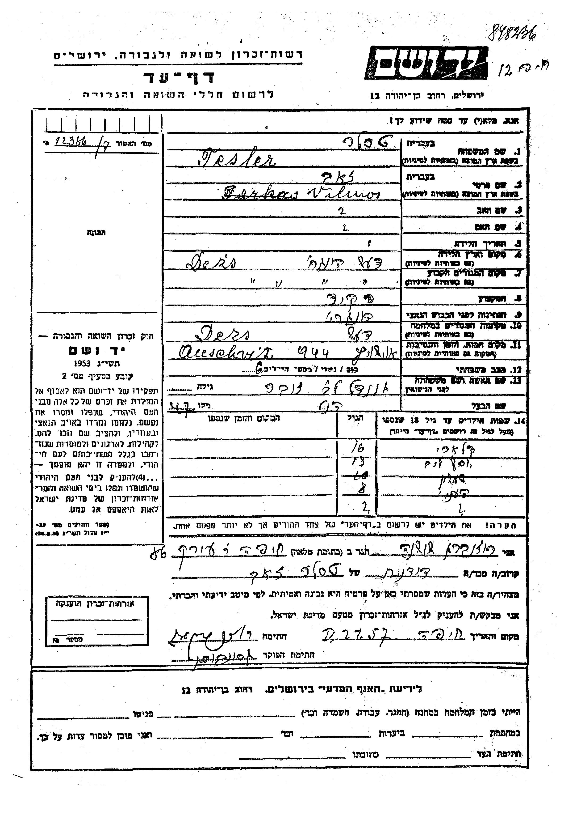 Яд Вашем - Листы свидетельских показаний Мемориального фонда