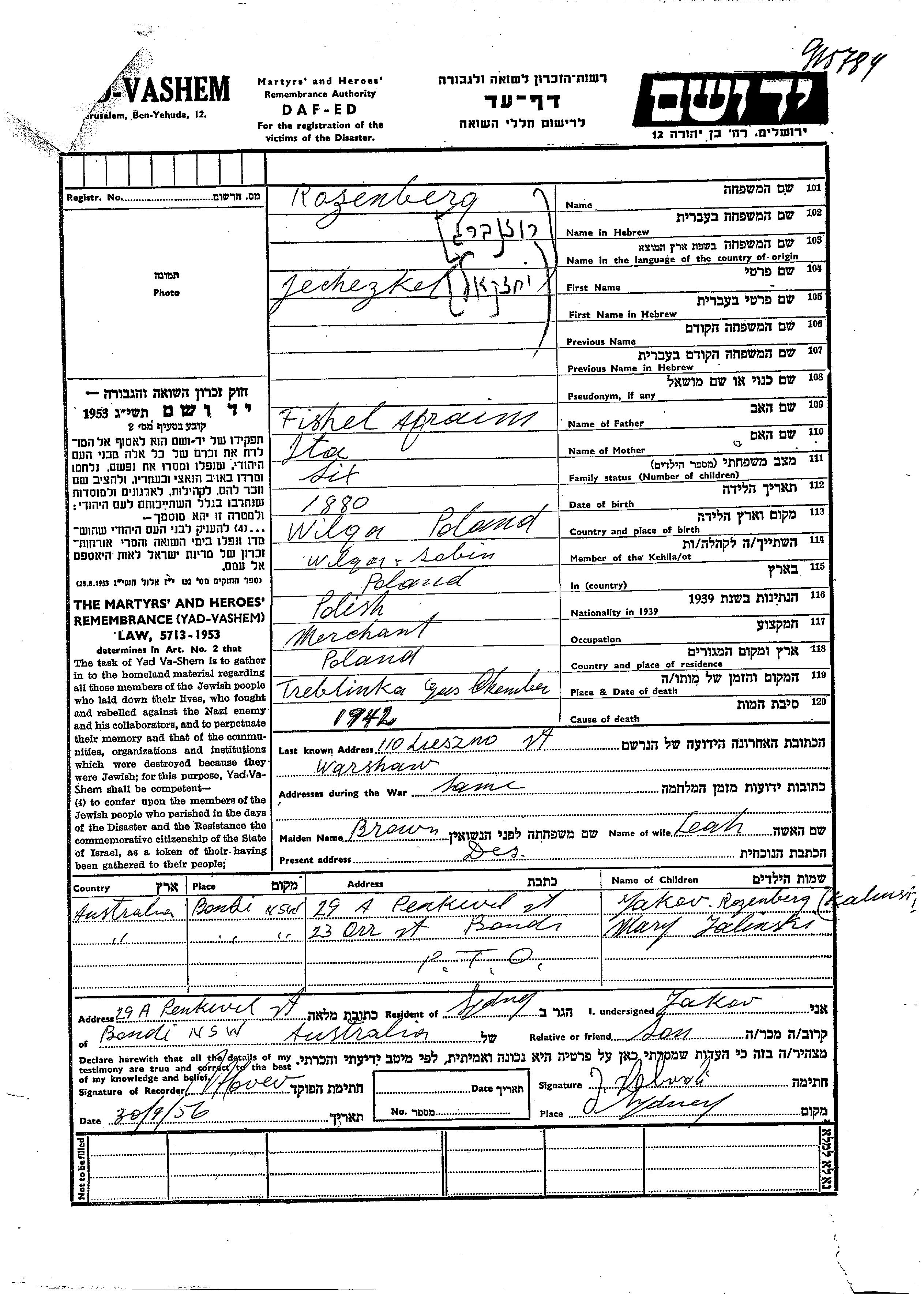 Яков Розенберг Иехезкель Лея девичья фамилия Броун. Место жительства до войны: Варшава, Польша. Место во время войны: Варшава, Польша.
