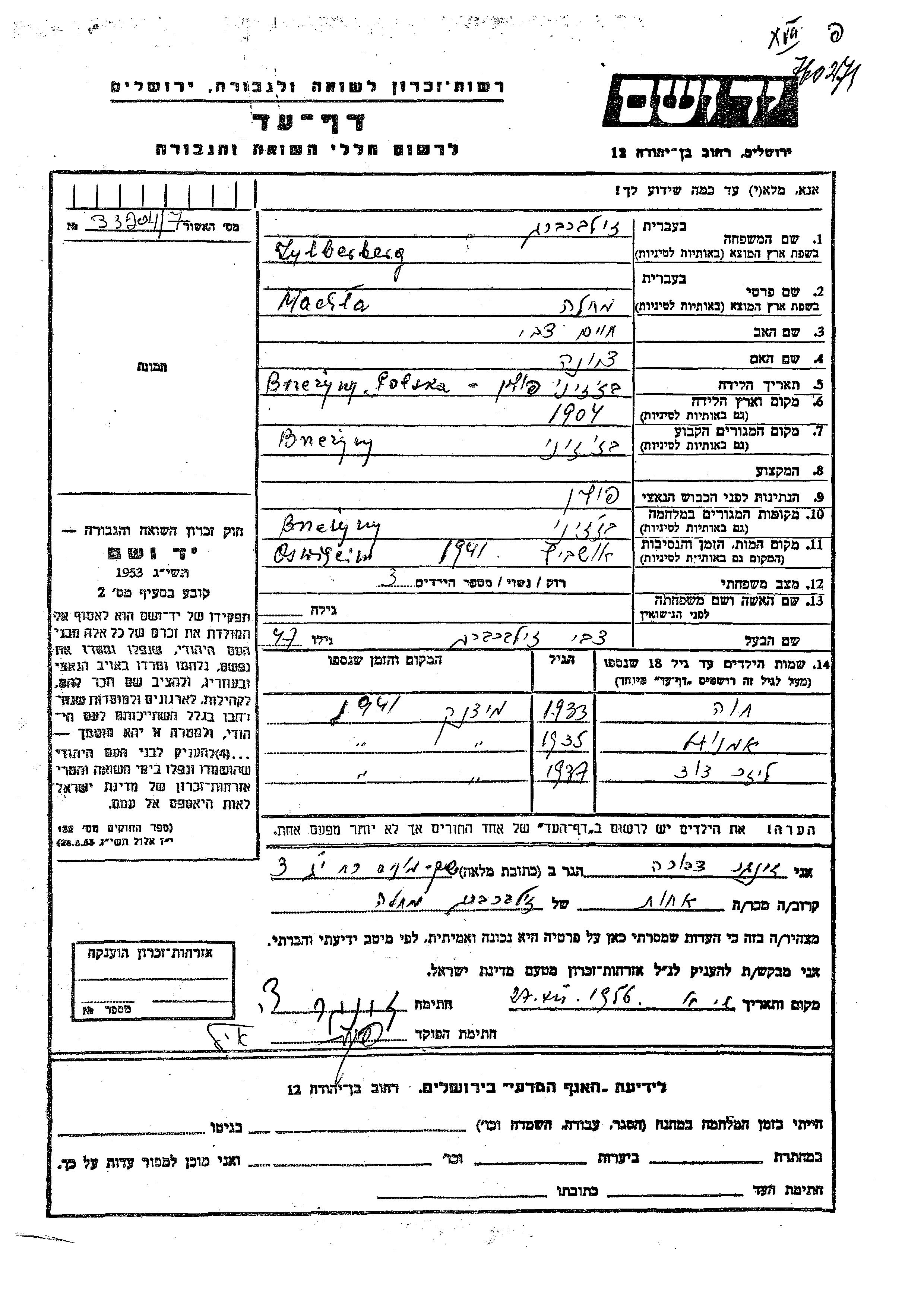 Зильберберг Лейзер Давид 1937 Brzezyny, Польша Лист свидетельских показаний