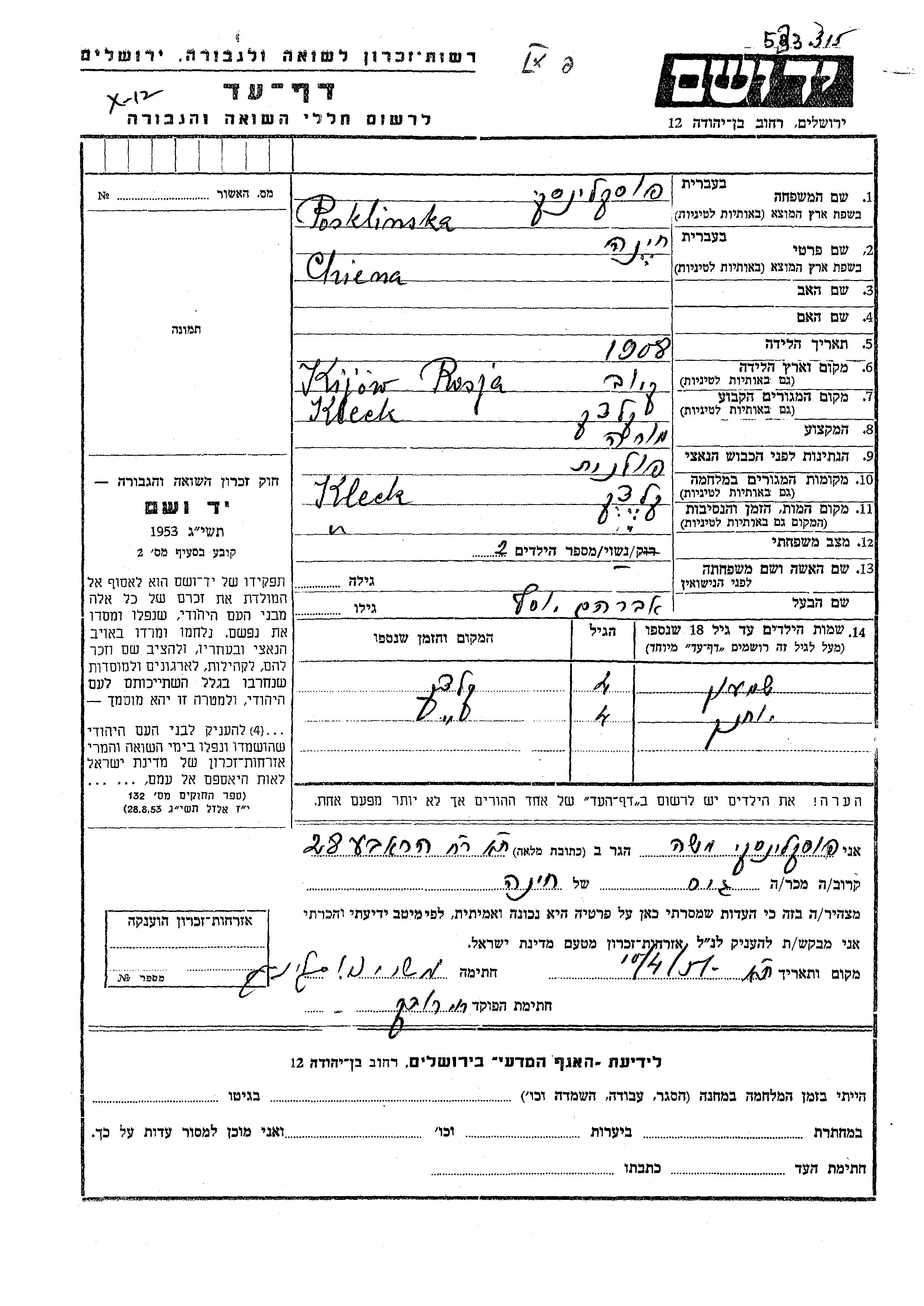Иоханан Посклинска Авраам Иосеф Хина. Ребенок. Место жительства до войны: Клецк, Польша. Место во время войны: Клецк, Польша.