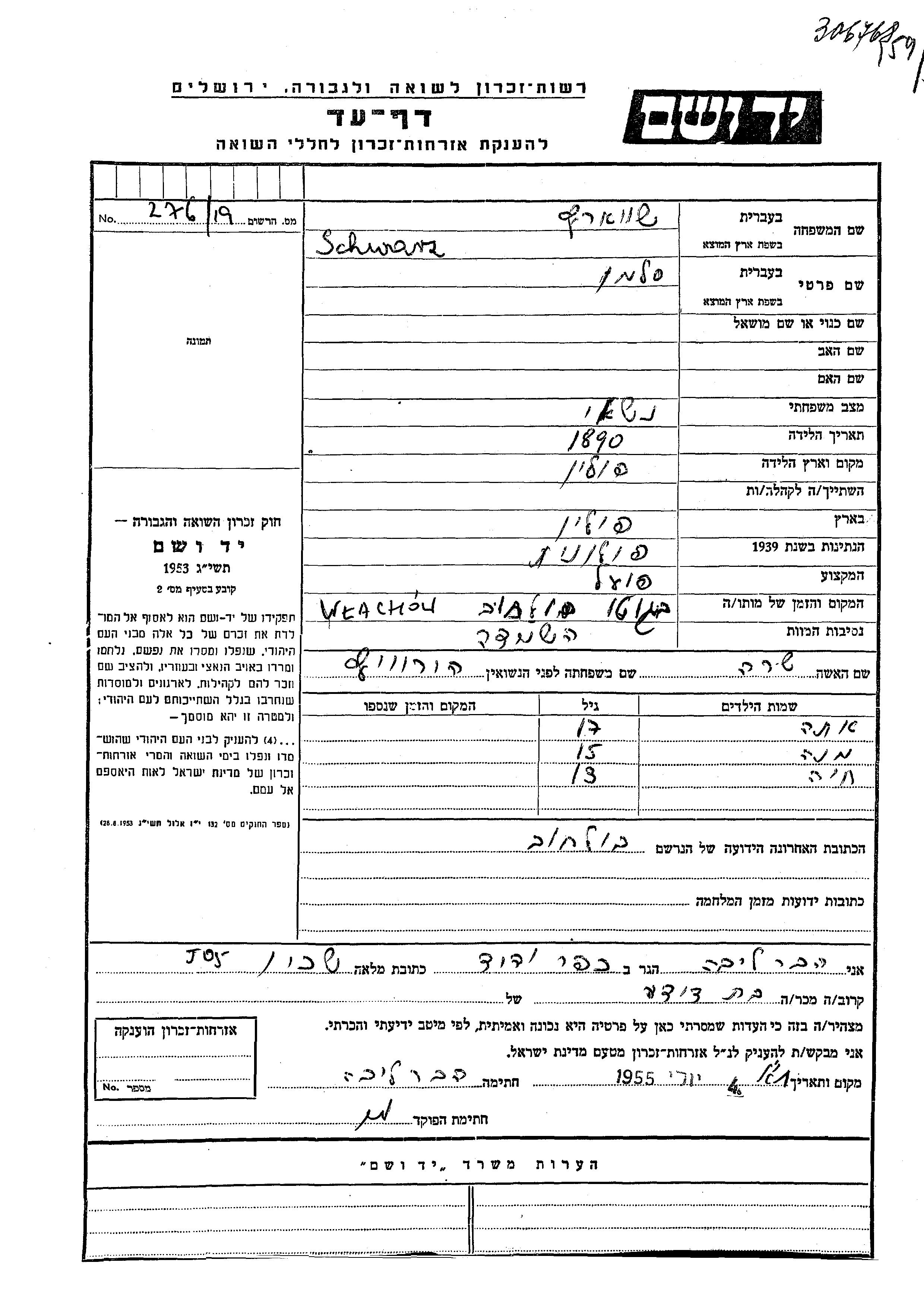 Шварц Мане место не указано, Лист свидетельских показаний