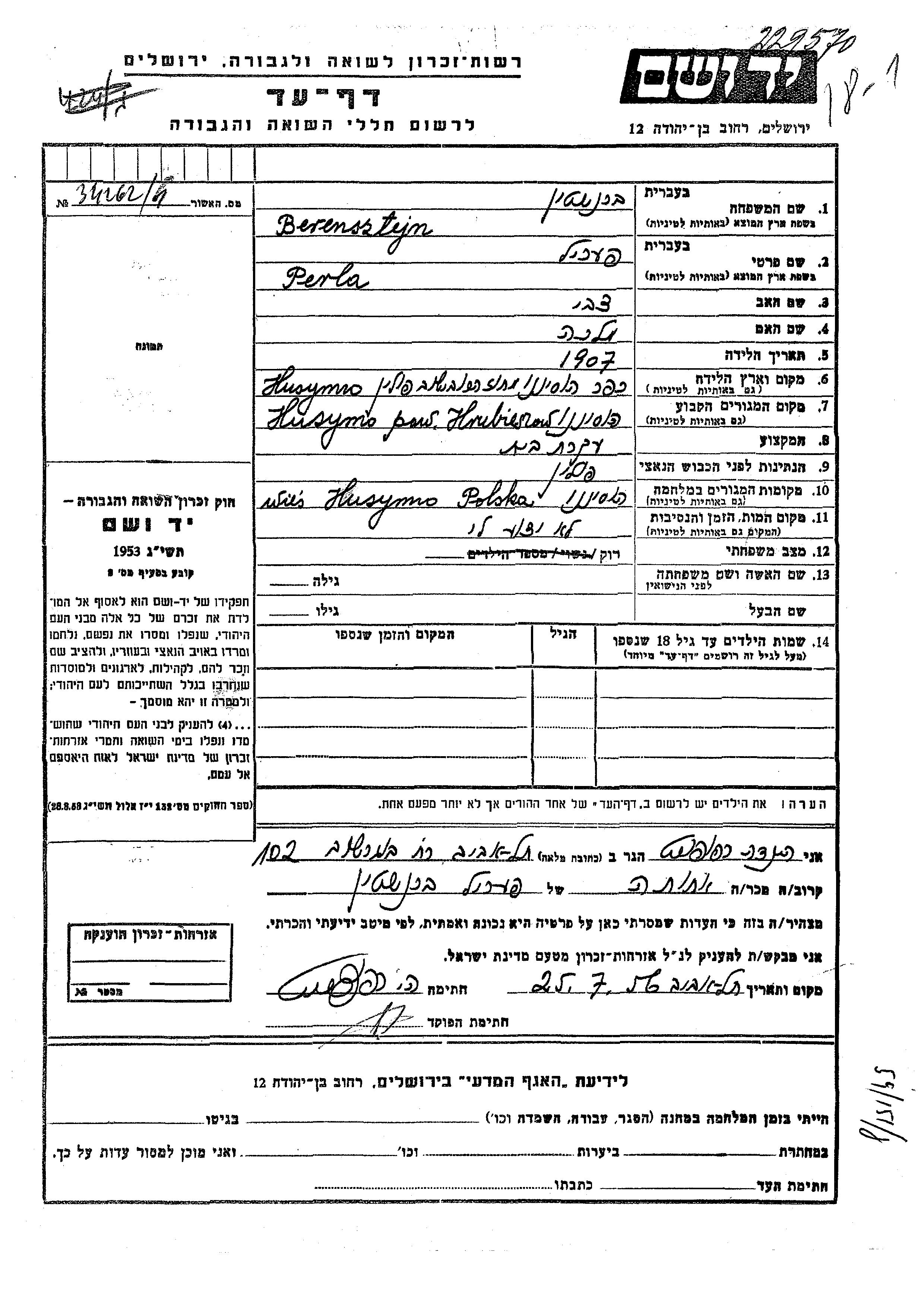 Перла Беренштейн, место рождения: Хусынне, Польша. Отец: Цви, mать:Малка. Домохозяйка. Холост / не замужем. Место жительства до войны: Хусынне, Польша. Место во время войны: Хусынне, Польша.
