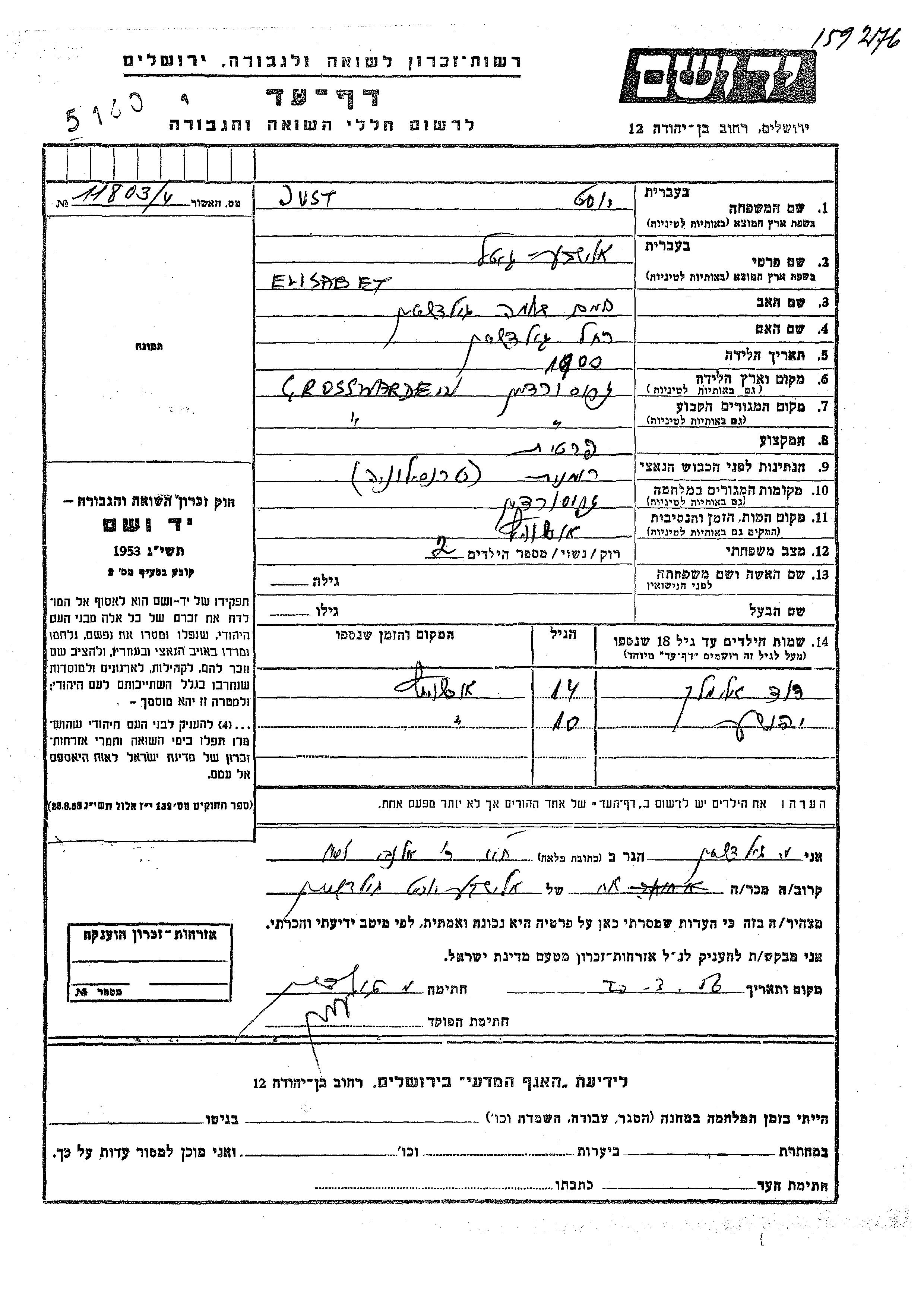 Иегошуа Юст Элизабет Элишева Гитель девичья фамилия Гольдштейн. Ребенок. Место жительства до войны: Гроссвардайн, Румыния. Место во время войны: Гроссвардайн, Румыния.