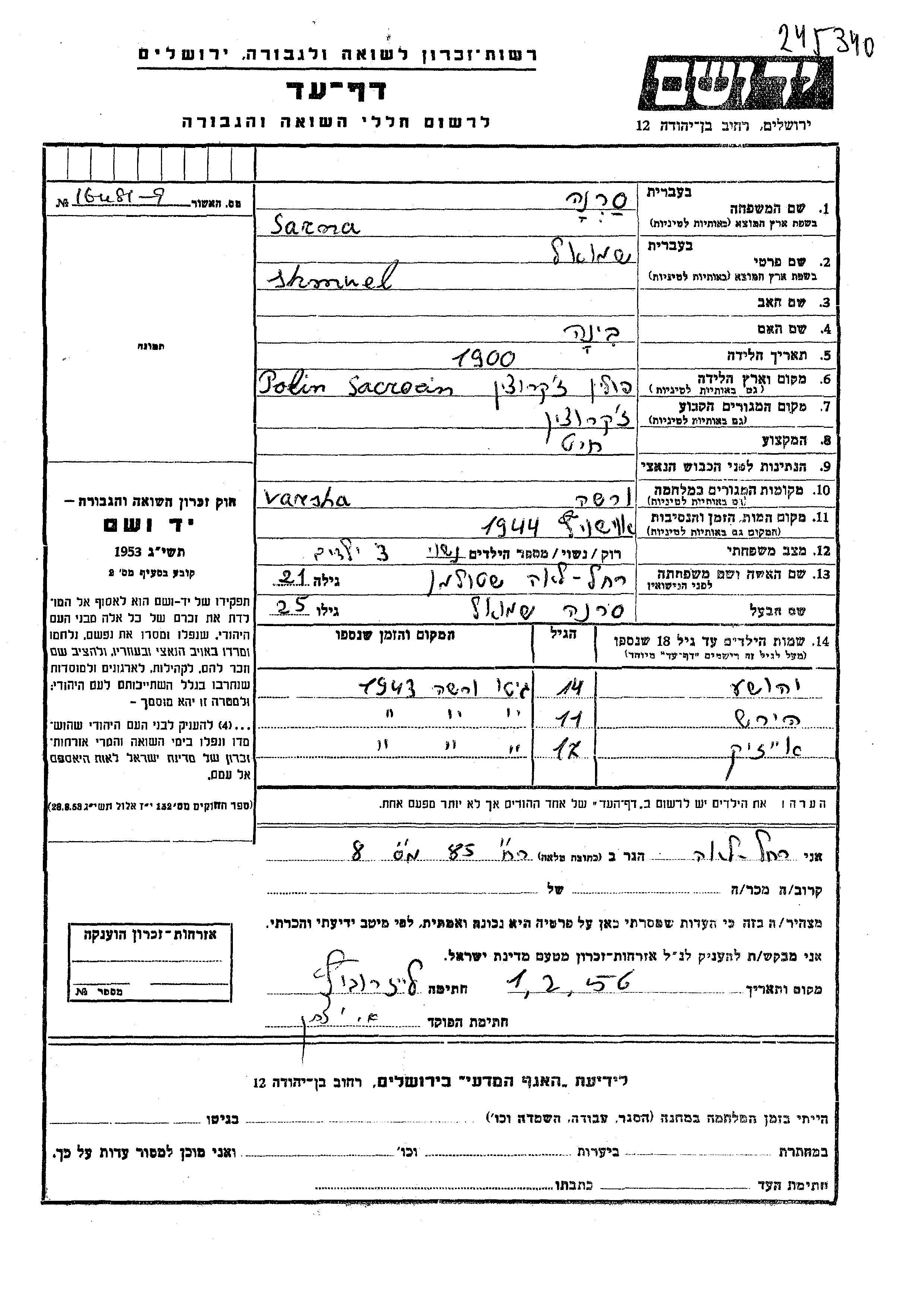 Иегошуа Сарна Шмуэль Рахель Лея девичья фамилия Штульман. Ребенок. Место жительства до войны: Закрочин, Польша. Место во время войны: Варшава, Польша.