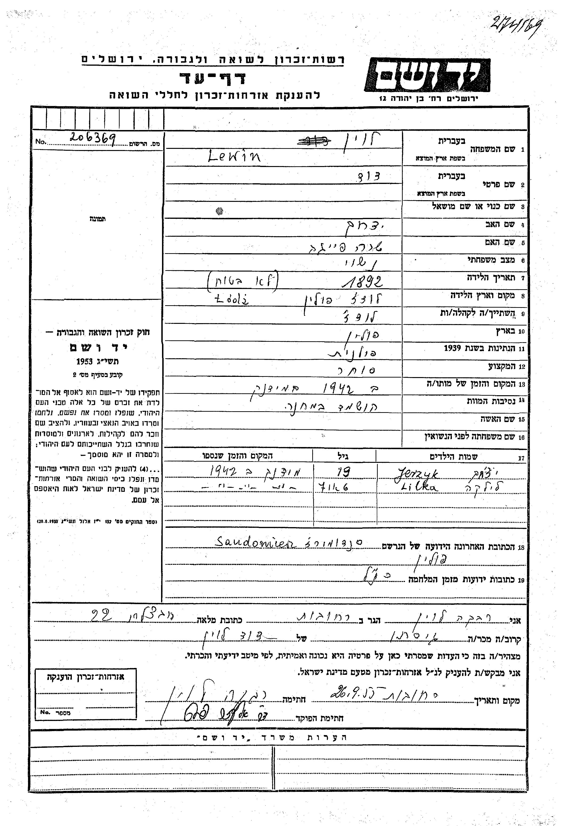 Левин Йешик Ицхак Лодзь, Польша Лист свидетельских показаний