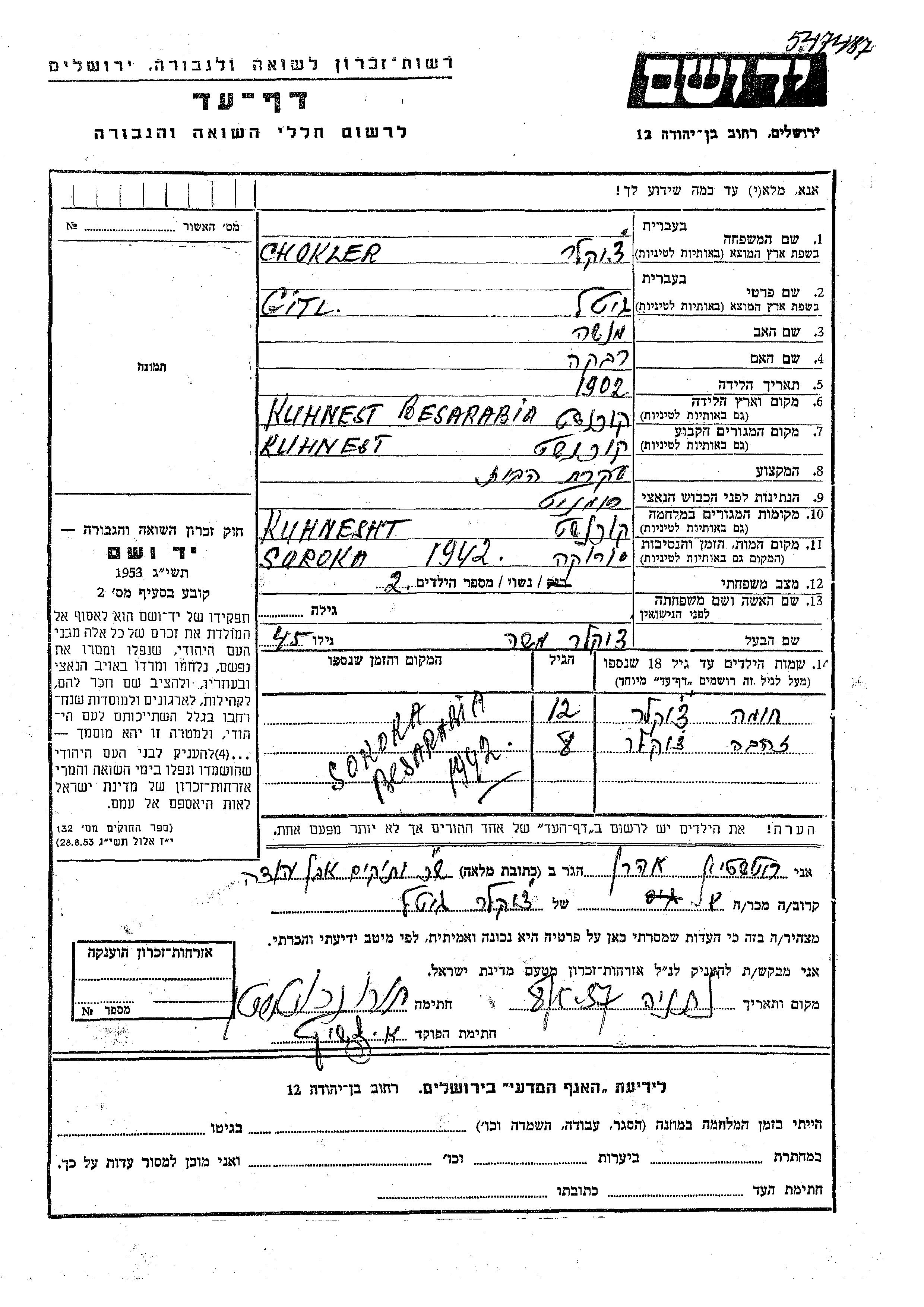 Хума Чоклер родился/родилась Моше Гитл. Ребенок. Место жительства до войны: Корнешть, Румыния. Место во время войны: Корнешть, Румыния.