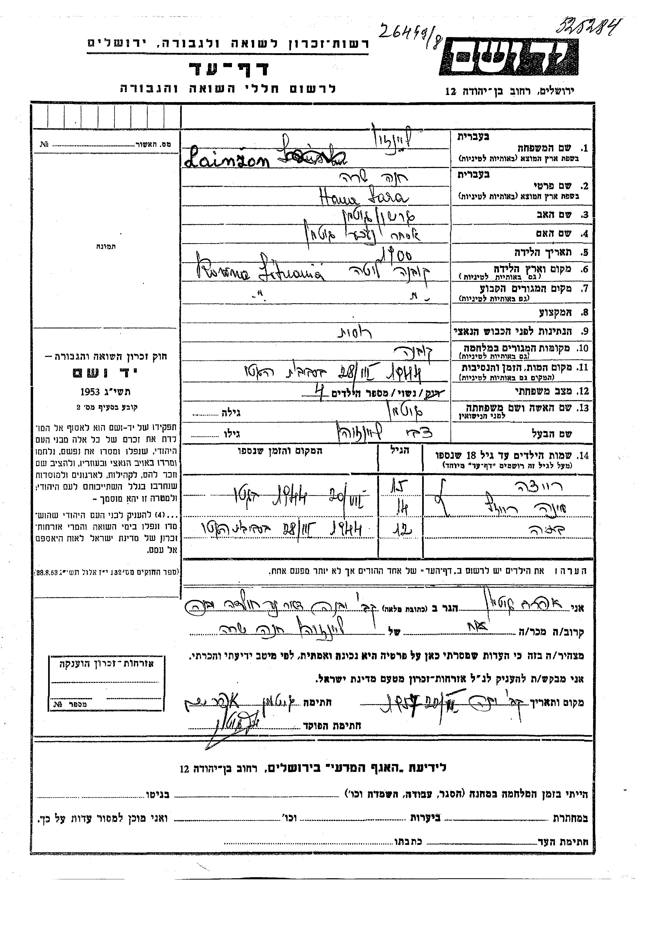 Яд Вашем - Листы свидетельских показаний Мемориального фонда